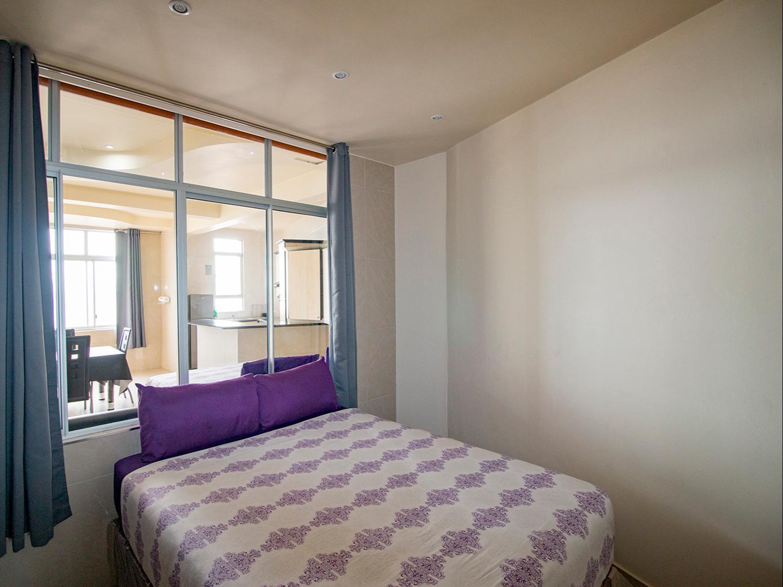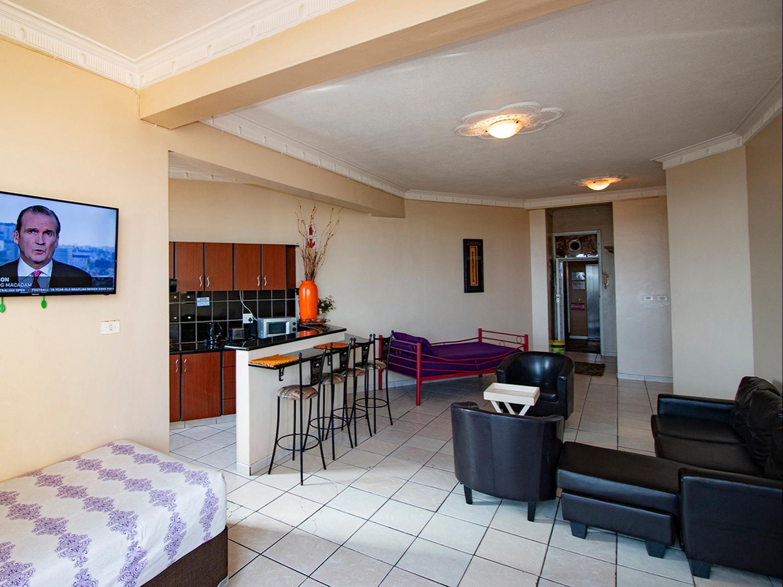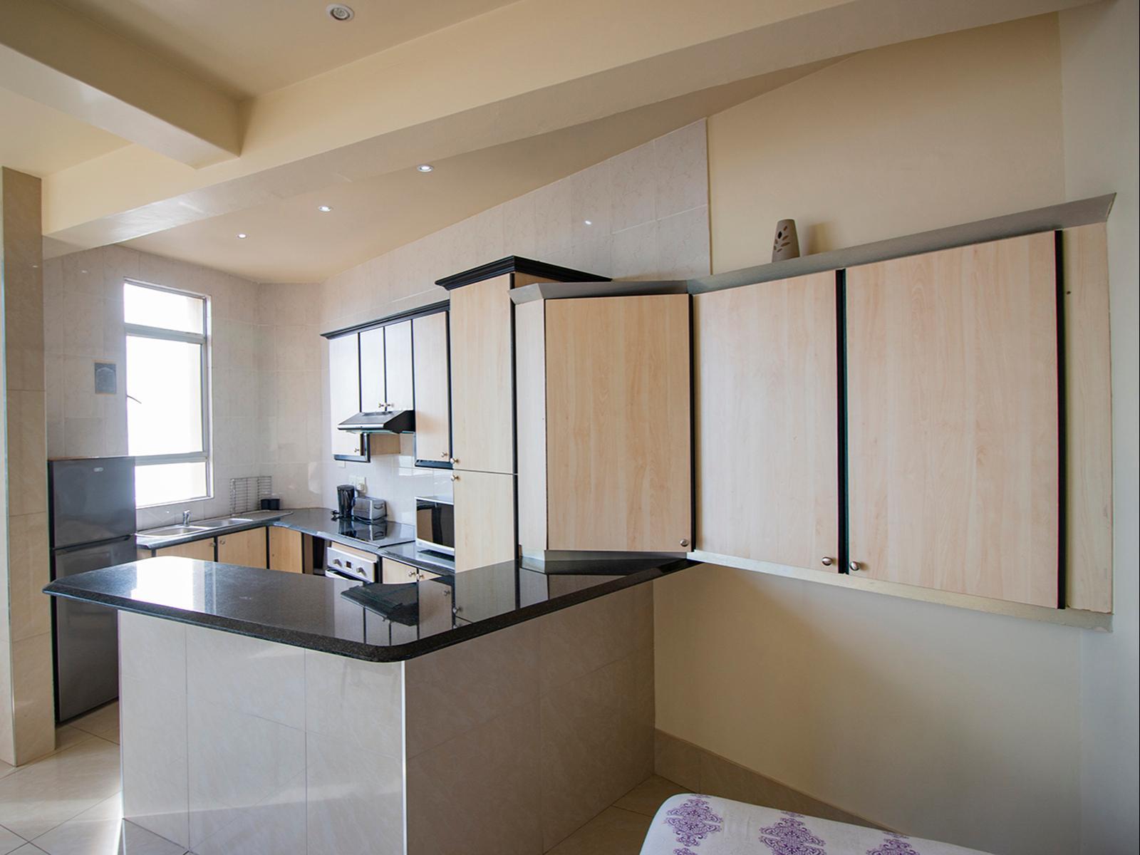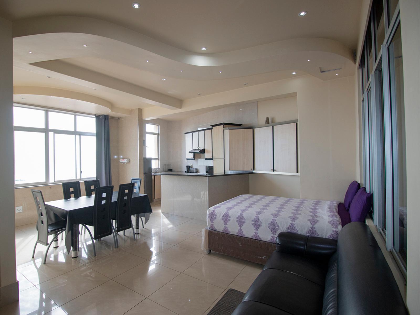 Marlborough Court 61 is a spacious penthouse apartment, situated on the top floor of the Marlborough Court apartment building. The apartment is newly furnished and fully fitted for self-catering.The apartment has three lovely rooms all with double beds. The master bedroom leads out onto the patio, and has an en-suite bathroom. The modern kitchen is fully equipped for self-catering and includes all new modern appliances, granite counter tops and all cutlery and crockery. The living area includes a dining table and lounge area with ample seating space and a TV. The lounge leads out o