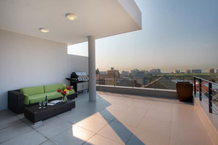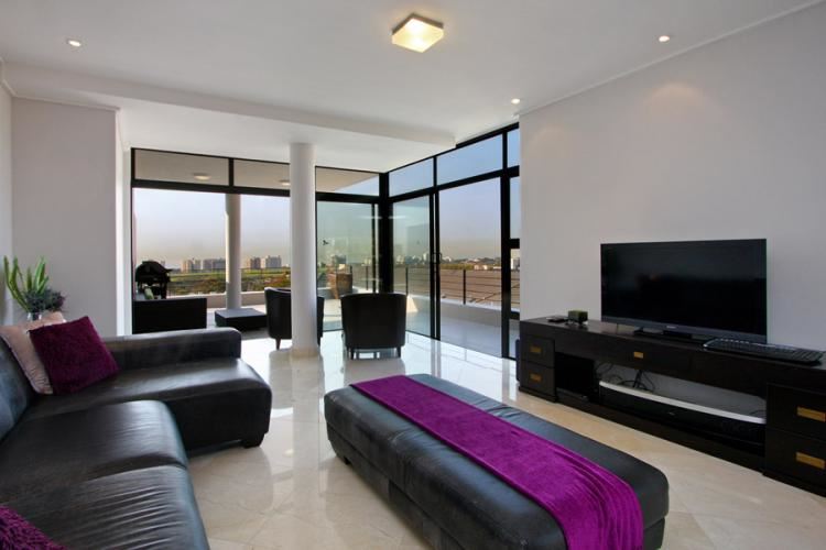 This spacious three bedroom and two bathroom self-catering apartment in Sea Point offers panoramic views of the City and Atlantic Ocean. ONLY bookable for families. The lounge, dining room, kitchen and large terrace with wrap around balcony are open plan and allow for easy flowing entertainment of guests. There is a fully equipped open plan kitchen with modern appliances including a dishwasher, a washing machine and a tumble dryer as well as a fridge/freezer and an oven with stove. All crockery, cutlery and linen are included. The lounge has a large plasma s