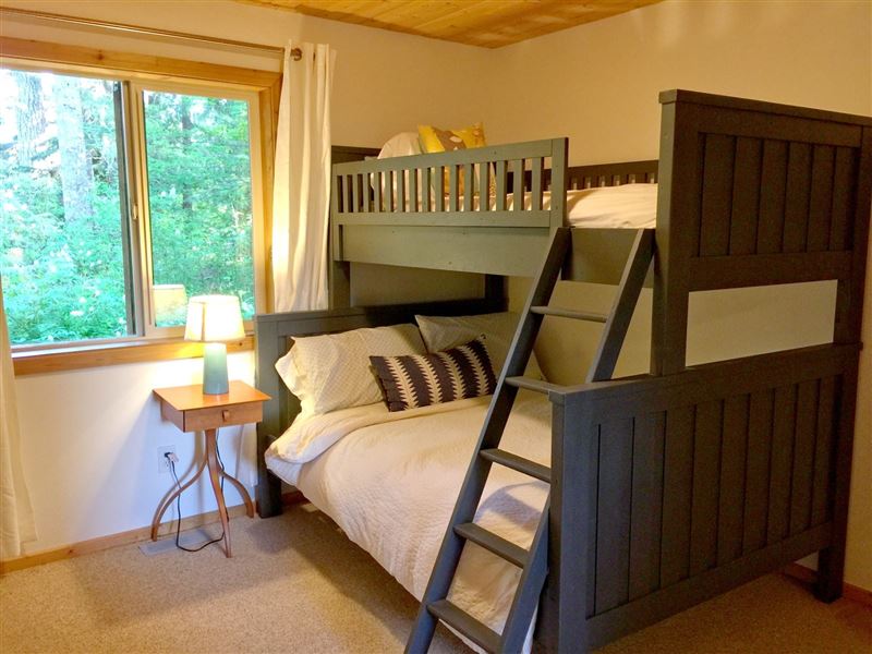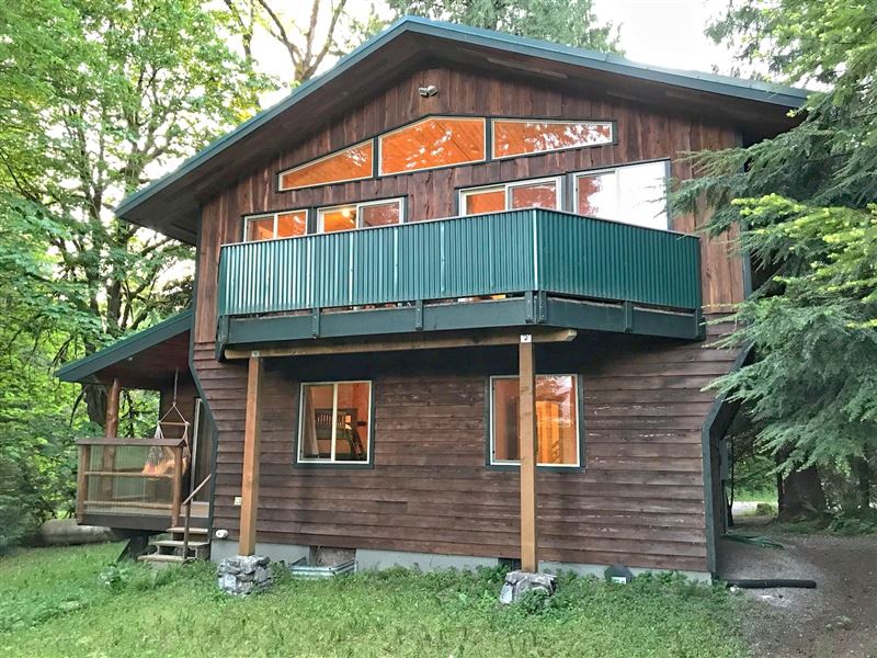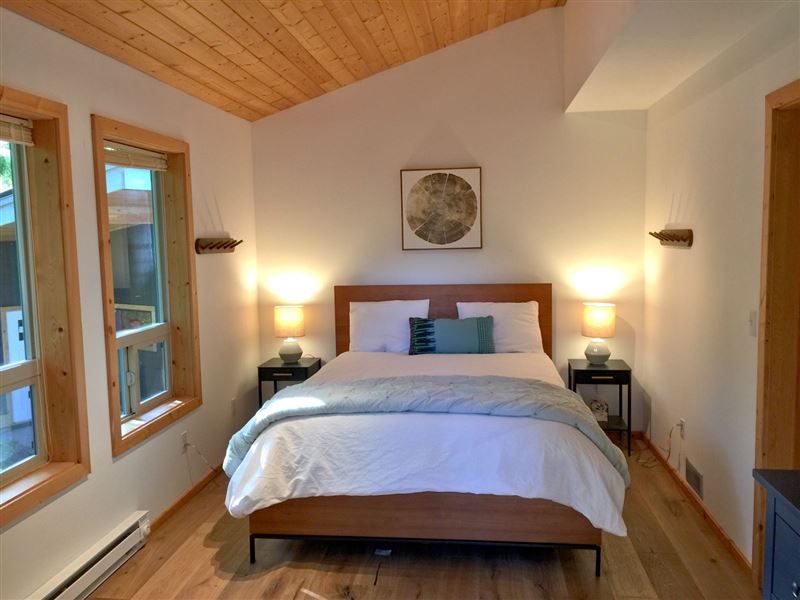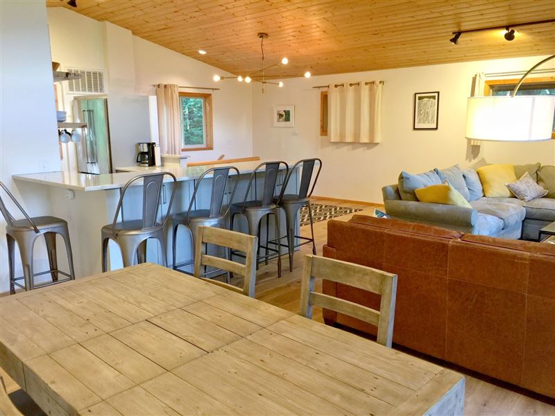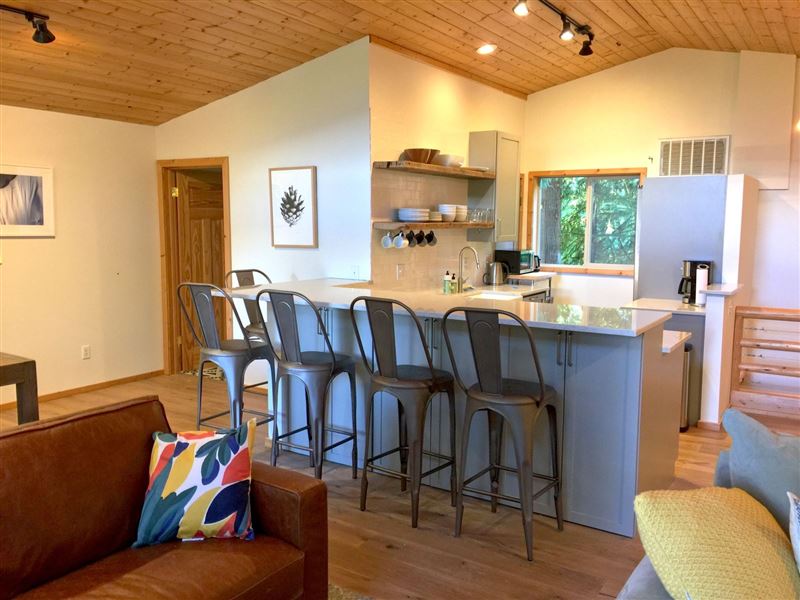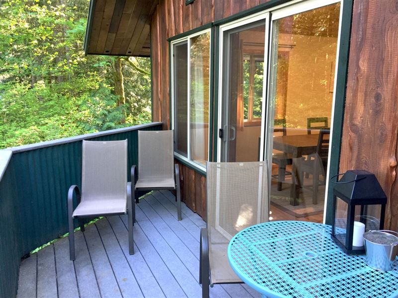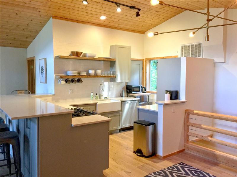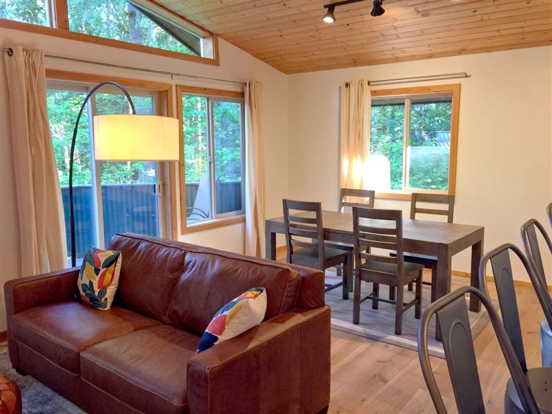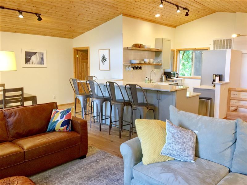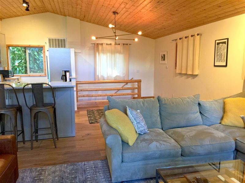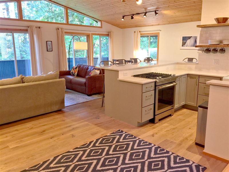 Breathtaking mountain vistas await you. Glacier, WA is encompassed with the Mount Baker Recreation Area which is a year-round playground.The first floor features a large mudroom for stowing your gear, along with a full size washing machine, a master bedroom with one queen size bed and a walk-out balcony. There is a second bedroom with one set of bunk beds.Ascending the stairwell to the second floor brings you into a large open living space with a fully equipped kitchen, complete with top-of-the-line appliances, granite countertops, and a breakfast bar, plus ample living