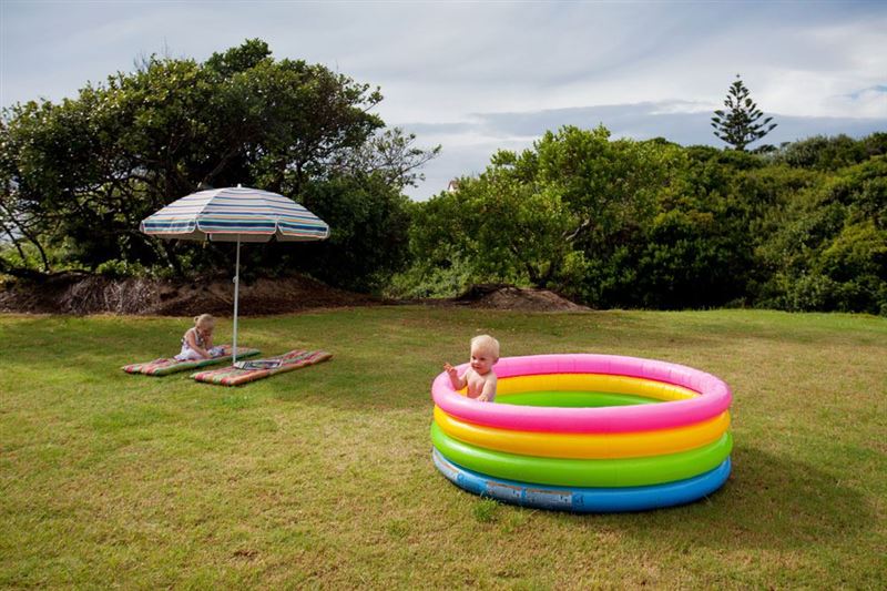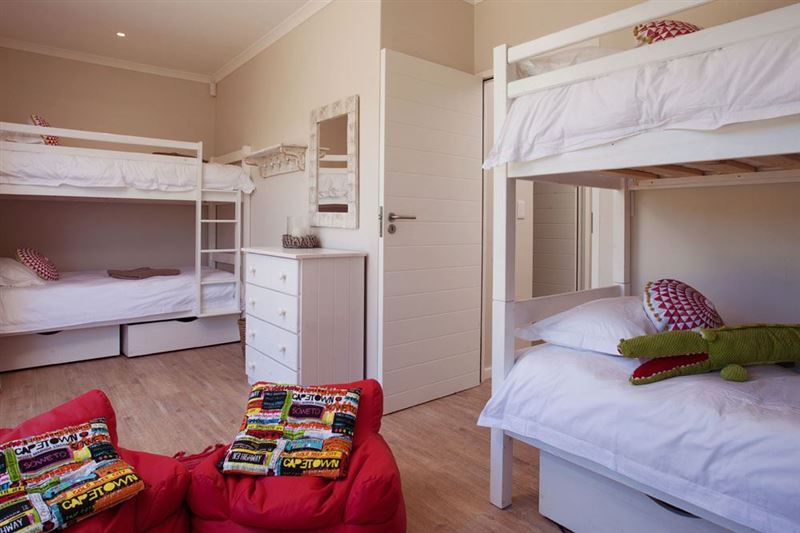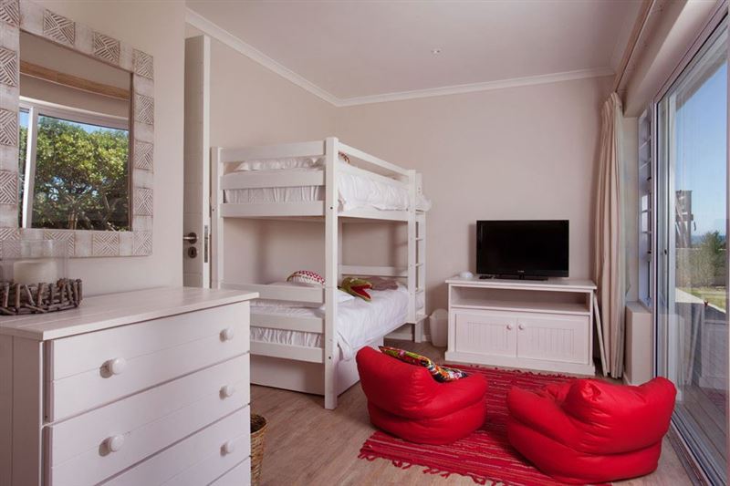 Dedicated children's room with 4 single bunk beds, comfy chairs, flat screen tv and sliding doors onto the level grassy garden with outdoor warm shower for post beach rinse!