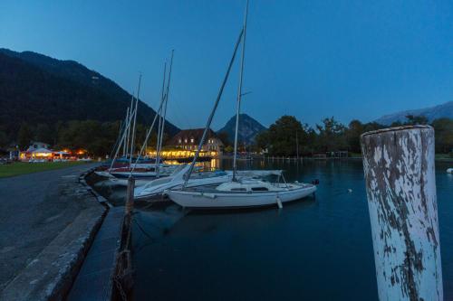 The exclusive Neuhaus Golf- & Strandhotel is Interlaken’s only hotel calmly situated right at the picturesque Lake Thun right next to the Neuhaus Ship Pier. The centre of Interlaken is 5 km away.It features a peaceful beach water sport facilities and a golf course.Enjoy pleasant walks through the nearby nature reserve or a scenic boat trip on the lake. Interlaken is also the main base for various excursions to the Jungfrau region.The cosy and comfortable rooms are located in 2 buildings and all have either superb lake or mountain views.In the well-known restaurant of the Neuhaus Golf- & Strandhotel you can enjoy local specialities as well as international and vegetarian dishes.The Neuhaus stop of bus line 21 is right in front of the hotel.
