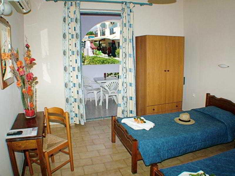 The hotel is located in the famous resort of Laganas, 100 m from the sandy beach and about 900 m from the main centre with its numerous restaurants, bars and nightlife venues. There is also a tourist office in the centre as well as lots of shops. Links to the public transport network can be found within a short stroll from the establishment.//The complex combines comfort and relaxation with its convenient location just 2 minutes' walk from the long sandy beach of Laganas. There are a total of 14 apartments at this aparthotel. Facilities include air conditioning, a 24-hour check-out service, a hotel safe, currency exchange, games room and a TV lounge.//The complex comprises 10 one-bedroom studios able to accommodate up to 3 persons, 2 one-bedroom apartments and 2 two-bedroom apartments each able to accommodate up to 5 persons. All are en suite with a shower. In-room amenities include a satellite/cable TV, radio, safe, kitchenette with fridge and microwave, as well as air conditioning and a balcony or terrace.//Guests at the hotel are welcome to use the swimming pool and all facilities of the Canadian hotel just a few minutes away. There are sun loungers with parasols laid out on the sandy beach.//The complex is only 900 m from the centre of Laganas. Near the hotel there are bus stops with buses passing every 10 minutes. Taxi transfer is also available from the Canadian reception. The airport is 6 km away.
