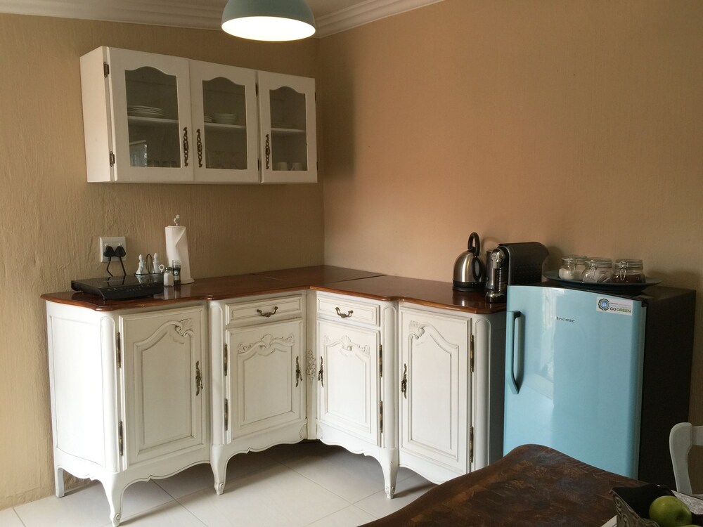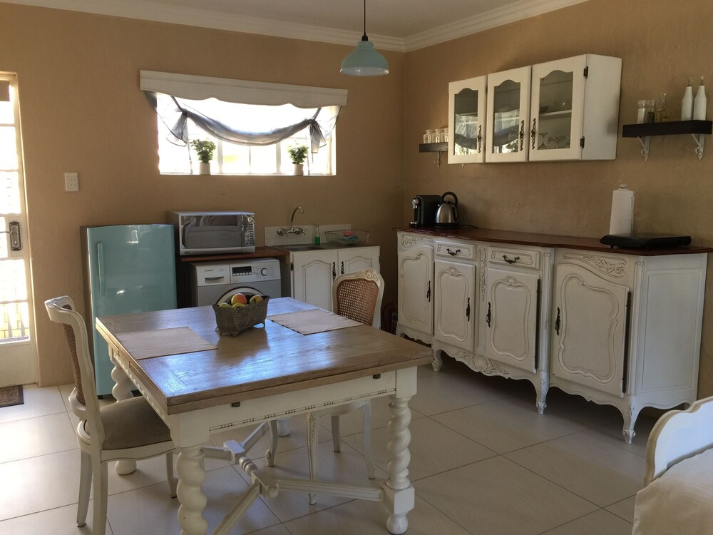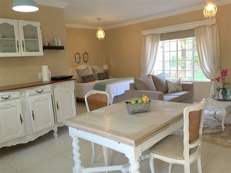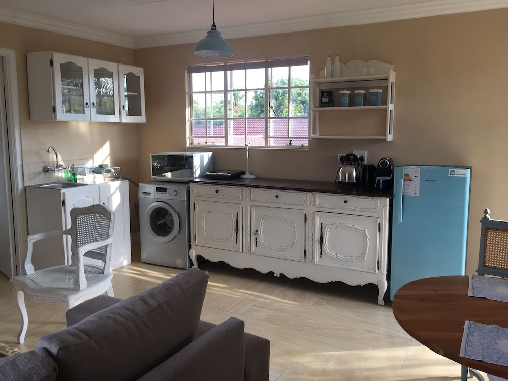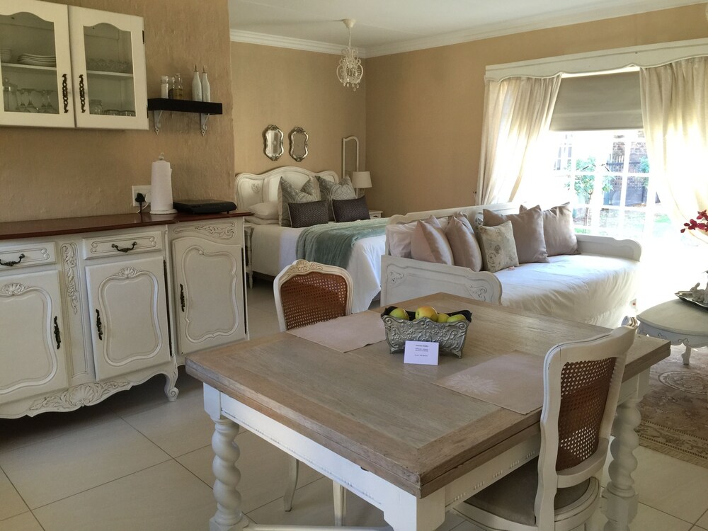 Nouveau Studios is situated in a quiet neighbourhood , with easy access to major routes. The restful, fully furnished, self-catering units with a private entrance and access to the outdoor patio and garden with pool. Classically decorated with all the luxuries needed for a great stay.We offer sunny north-facing apartments, consisting of a bedroom, sitting area with TV, a kitchen and dining area with a private bathroom. The kitchen includes a coffee station, complete with coffee machine, induction stove, microwave, fridge and a washing machine. The dining area is adequately equippe