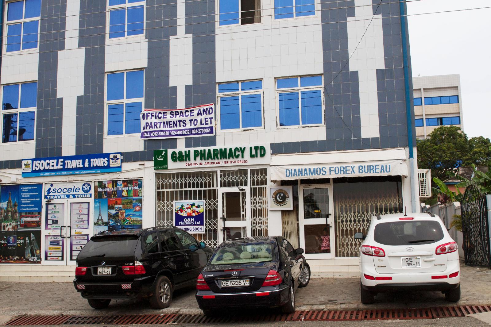 The Hotel is just off Osu's Oxford Street, about 100 metres from Trust Hospital. The Hotel has a pharmacy and a travel agency in front and the hotel entrance is to the rear. The rooms are spacious and tastefully decorated. The property is about 20 minutes from the airport; 10 minutes from the Ministries and most government offices; and about 15 minutes from the tourist attractions along the High Street.
