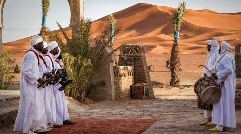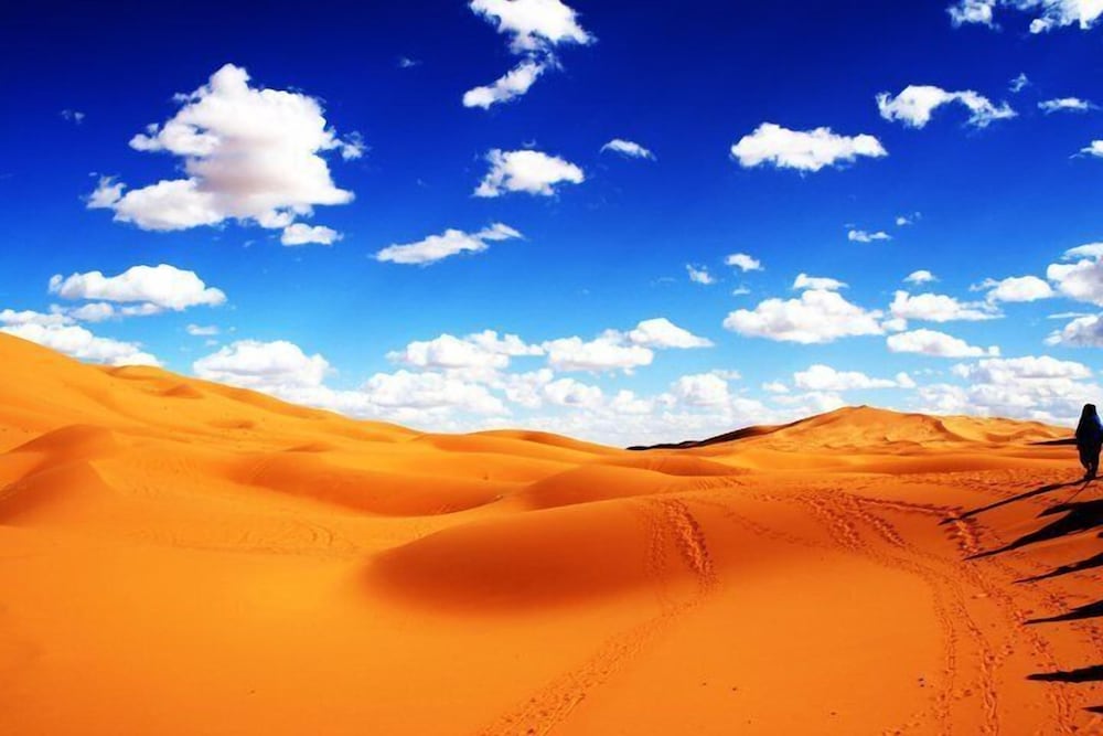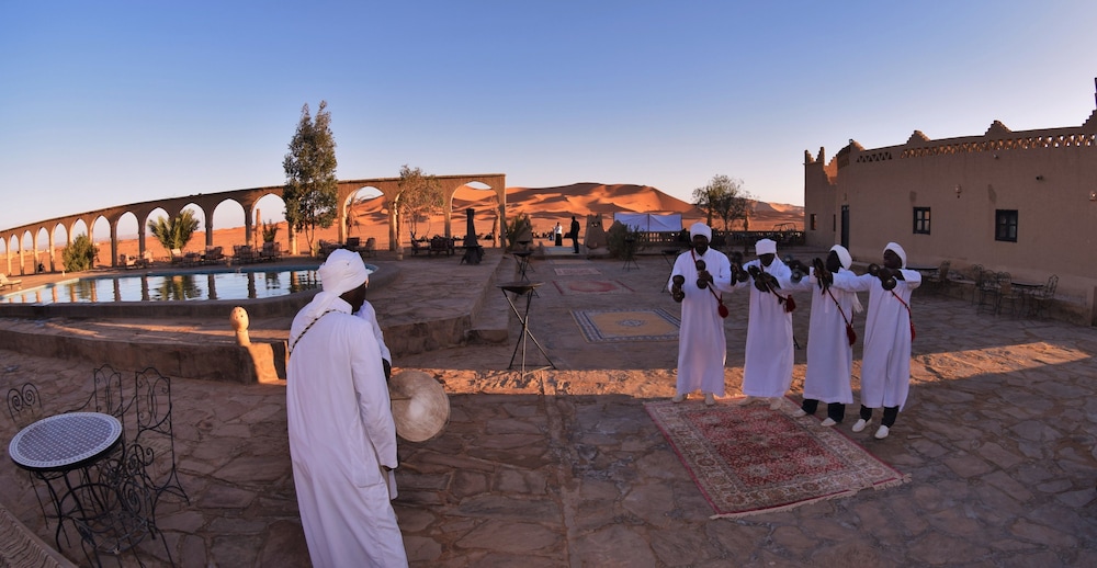 With a prime position overlooking the biggest dunes of Mergouza Palmeras Y Dunas offers panoramic views and an outdoor swimming pool.All the air-conditioned rooms and suites are equipped with a private bathroom. Some of them have views over the Dunes of Merzouga.The Palmeras restaurant serves traditional Moroccon cuisine and a barbeque buffet. There is a bar and snack bar and rooms service is available.Guests can walk just 15 minutes to a view point for watching the sunset. Other excursions such as camel rides and dune buggies can be organised from the hotel.Ideally located Palmeras Y Dunas is just 800 meters from the lake of Erg Chebbi. It is only 15 km from Mergouza airport. A shuttle service is available at an extra cost.