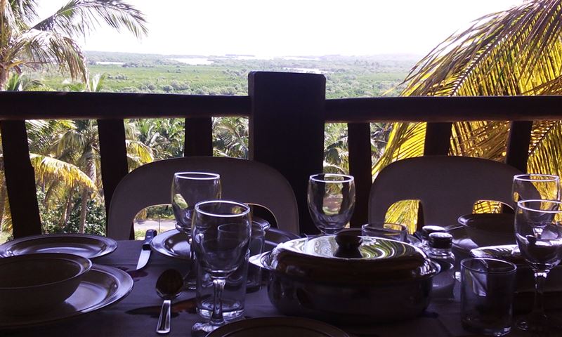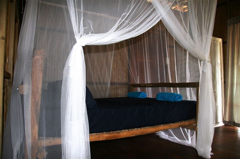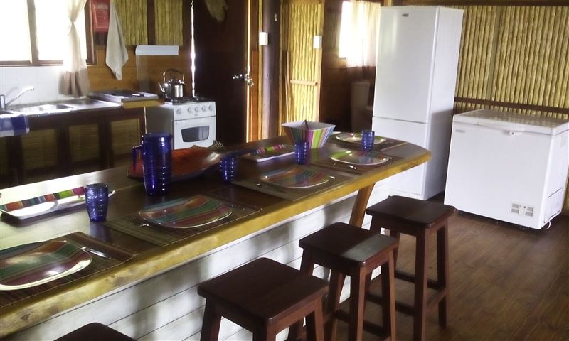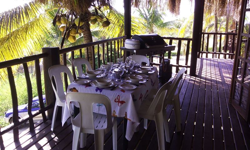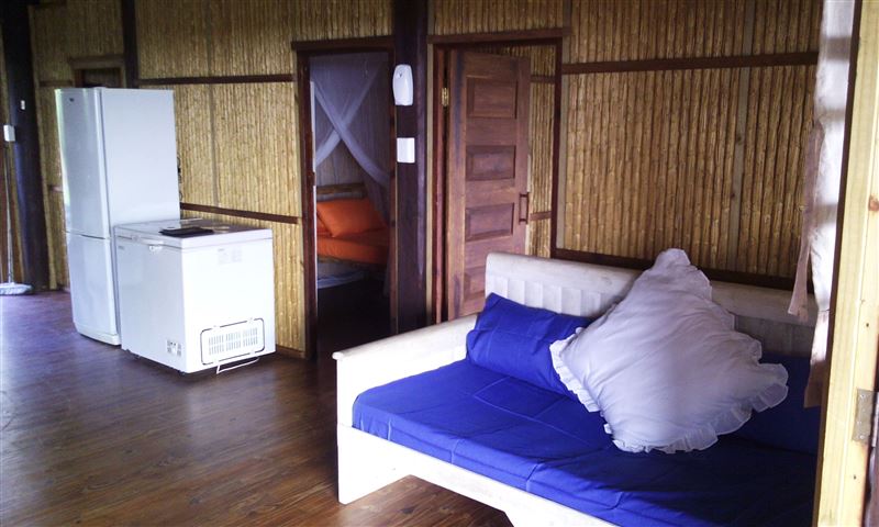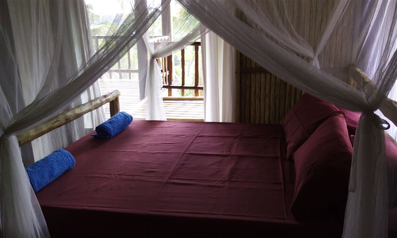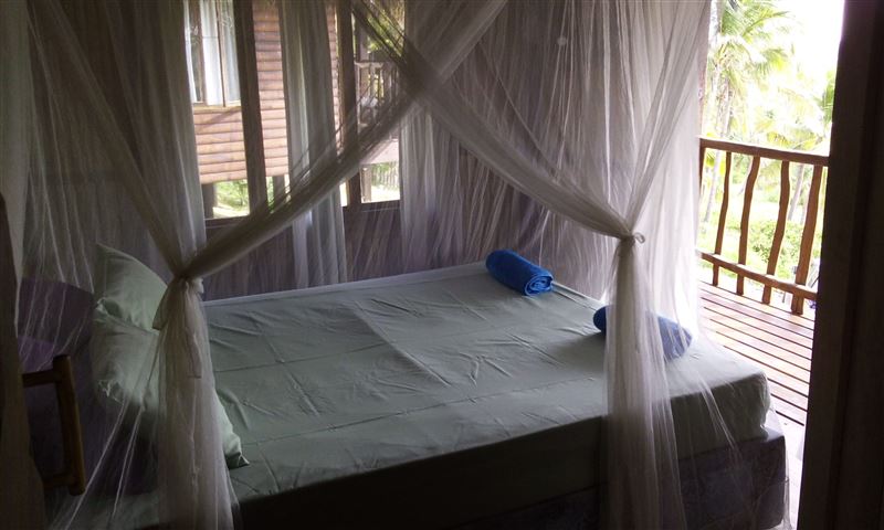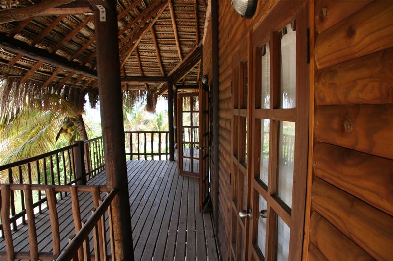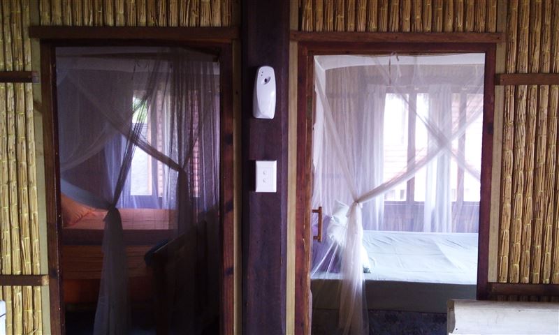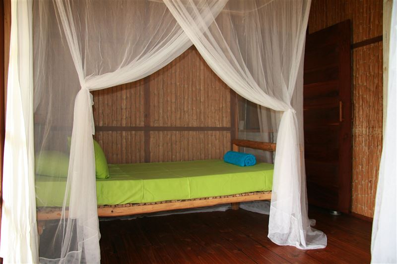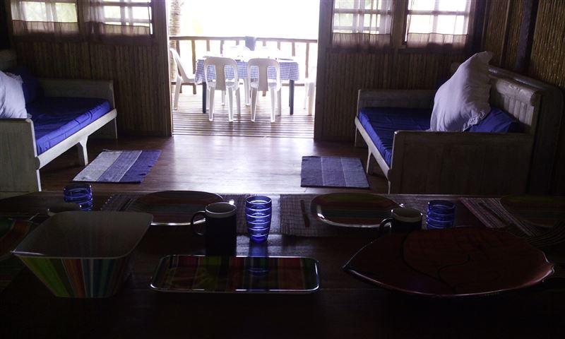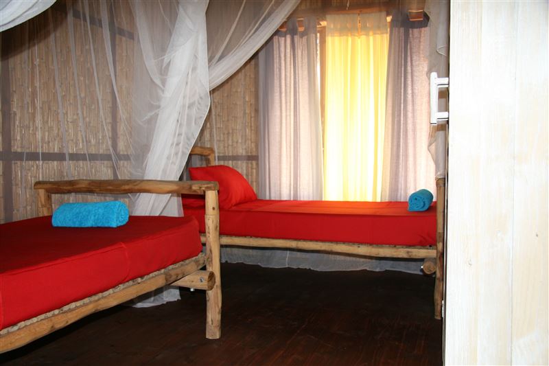 Palm View Lodge is a self-catering lodge situated at Barra Beach, Inhambane, Mozambique. The lodge is built on the side of a west facing dune, overlooking the estuary with a view of the sea to the north. As the sun sets, the view is one of the best Barra has to offer. The lodge compromises of two timber houses, each with three bedrooms and capable of sleeping eight persons. The main bedroom has an en-suite bathroom with a bath, a shower, a basin and a toilet. A second bathroom has a shower, a basin and a toilet and is shared with the remaining two bedrooms. An open-plan spacious ki
