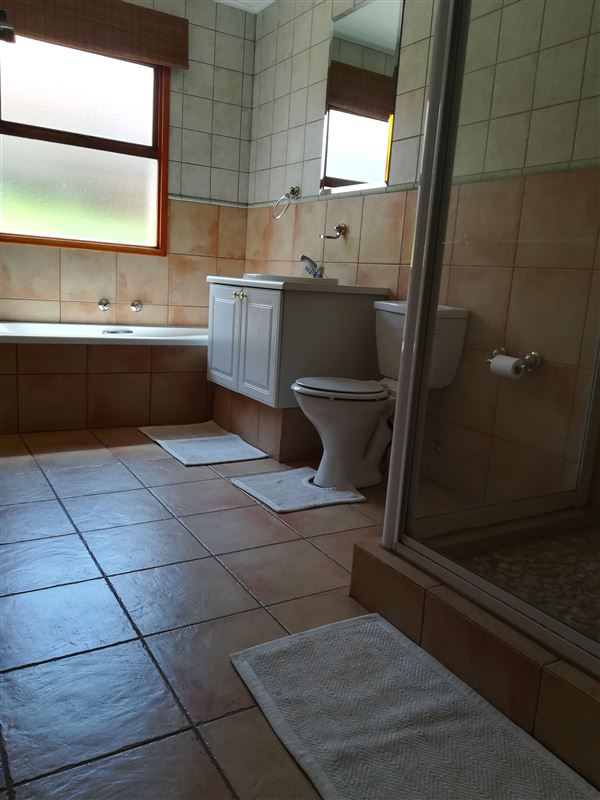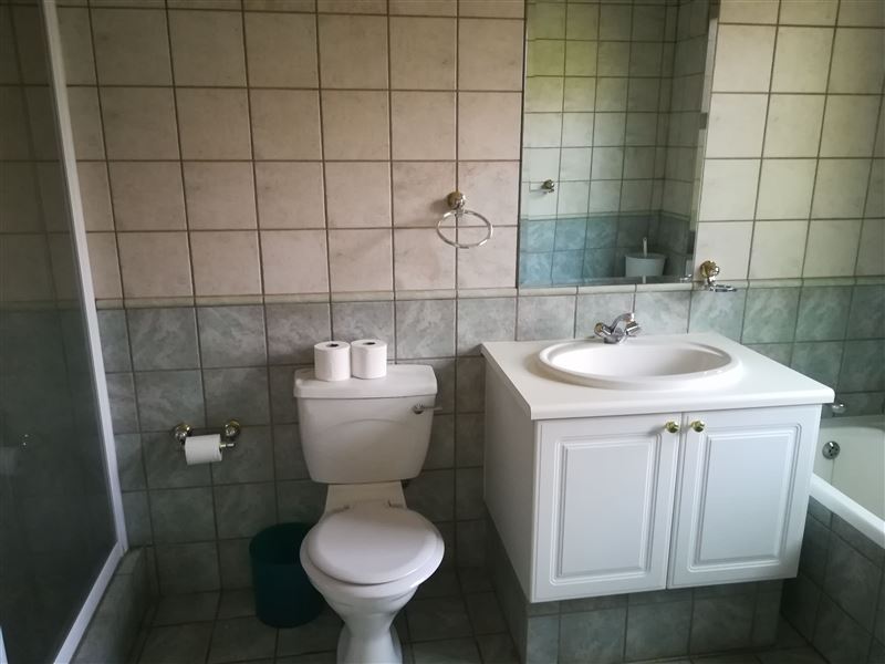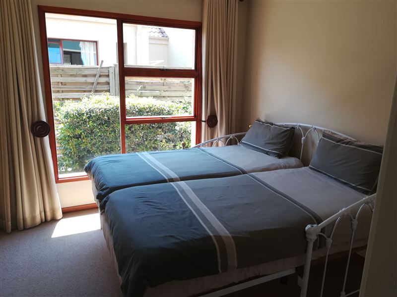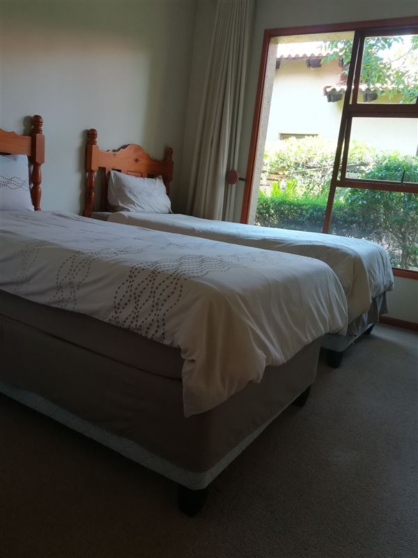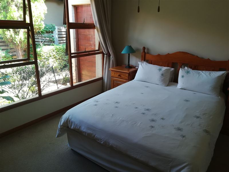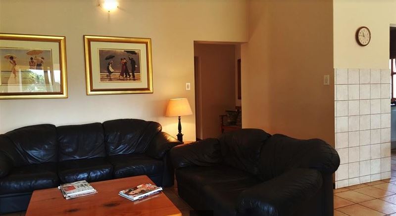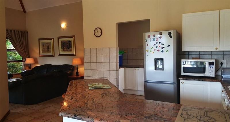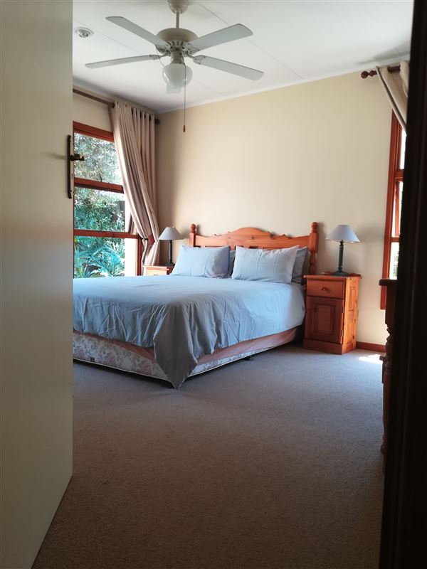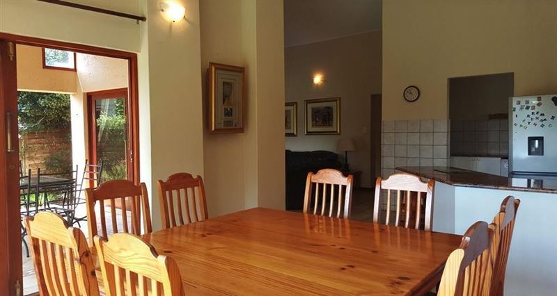 This is a beautiful four bedroomed house, fully furnished and located on a golf estate. Guests have access to the estate golf cart, pool and braai facilities. Four bedrooms are available for occupation by up to 8 people.Walking up to the house you are lead through a lush garden which takes you to the front door. This is an ideal family or friends home with four large comfortable bedrooms and two bathrooms (1 ensuite). The kitchen has ample cupboards with granite tops and a large scullery. The double volume open-plan kitchen, lounge and dining room flows out onto the ve