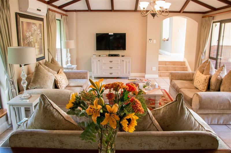 Augusta Lodge is a large and spacious house on the beautiful Selborne Golf Estate. The house sleeps 10 adults + 4 Children and is ideal for a large travelling party. The house is well equipped and provides everything guests require for a relaxed self-catering holiday. There are four bedrooms upstairs that have twin beds and en-suite bathrooms as well as a fifth bedroom downstairs with a queen-size bed. An additional bunk room sleeps two children and there is a sleeper couch in the upstairs living area for two more children. Each of the bedrooms has a TV.The open-plan lo