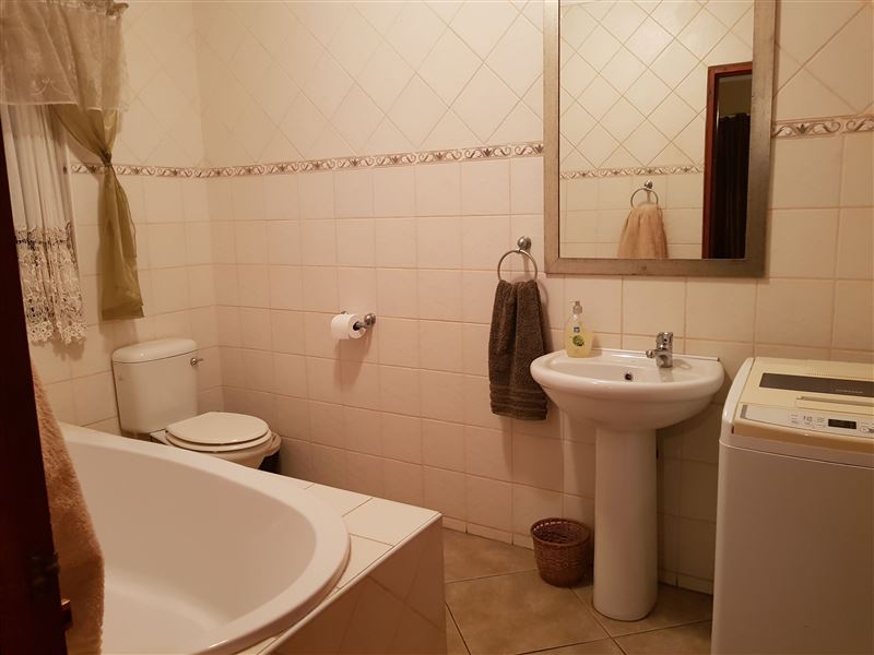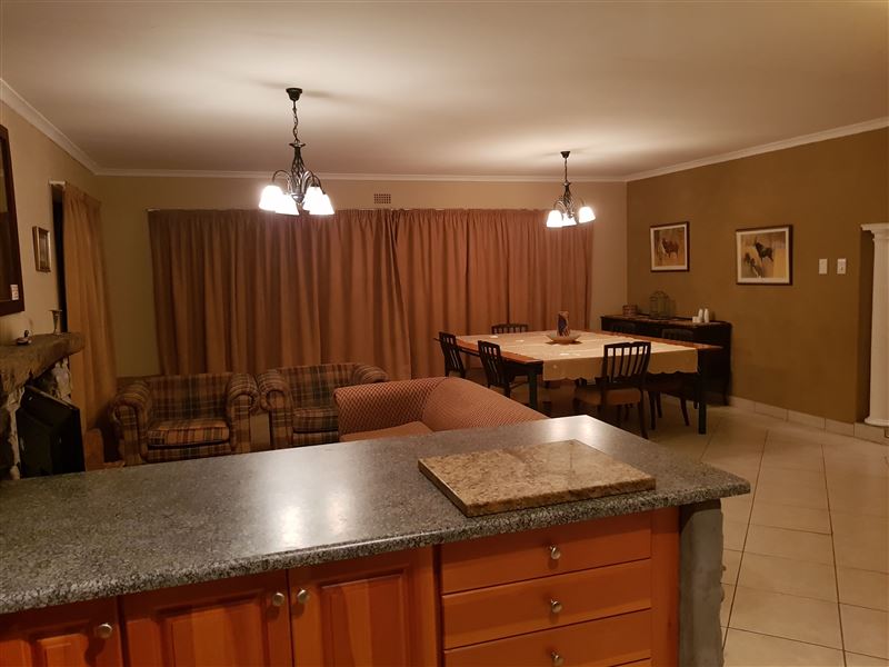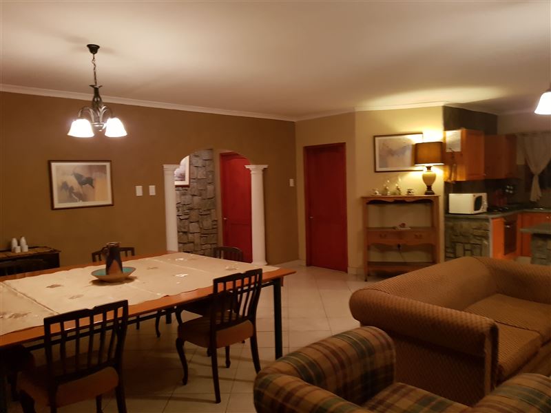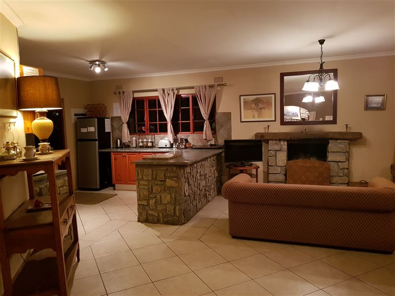 The open-plan living area is composed of a lounge with a fireplace, dining room and fully equipped kitchen. There is a sleeper couch in the lounge able to accommodate a further two guests with prior arrangement. Guests also have access to DStv.