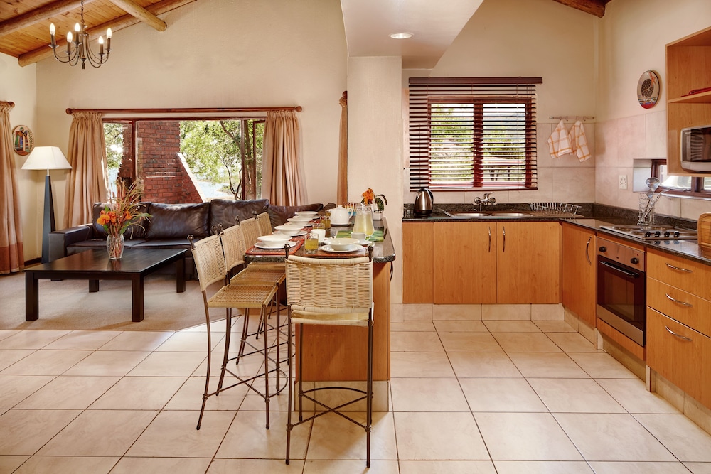 The chalets also feature two bathrooms, a well-equipped kitchen (including an oven and microwave), a TV with limited DStv channels, a fireplace, and a braai area for those late afternoon braais. The units are serviced on a daily basis (excluding Sundays/public holidays).