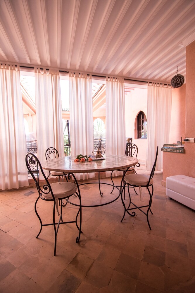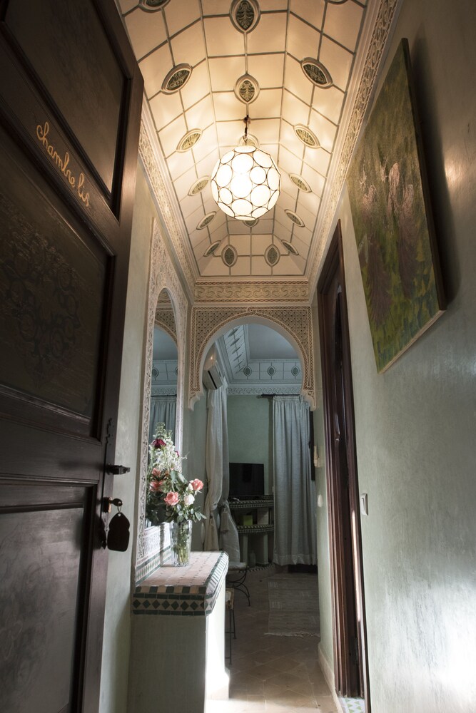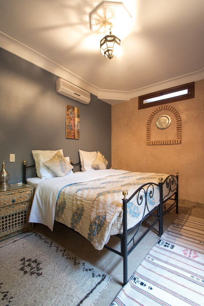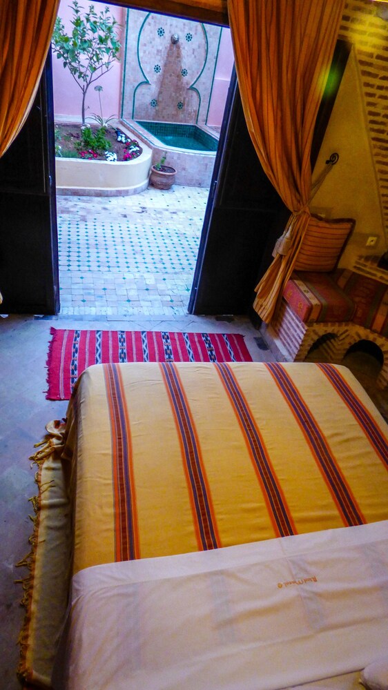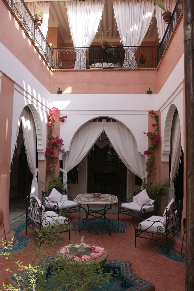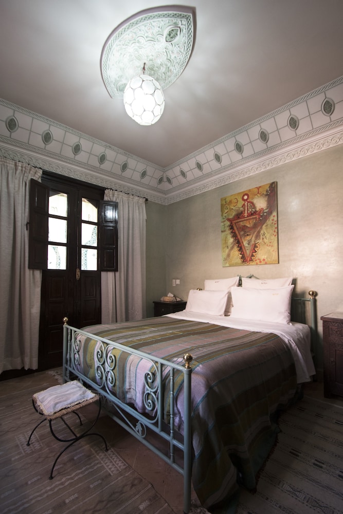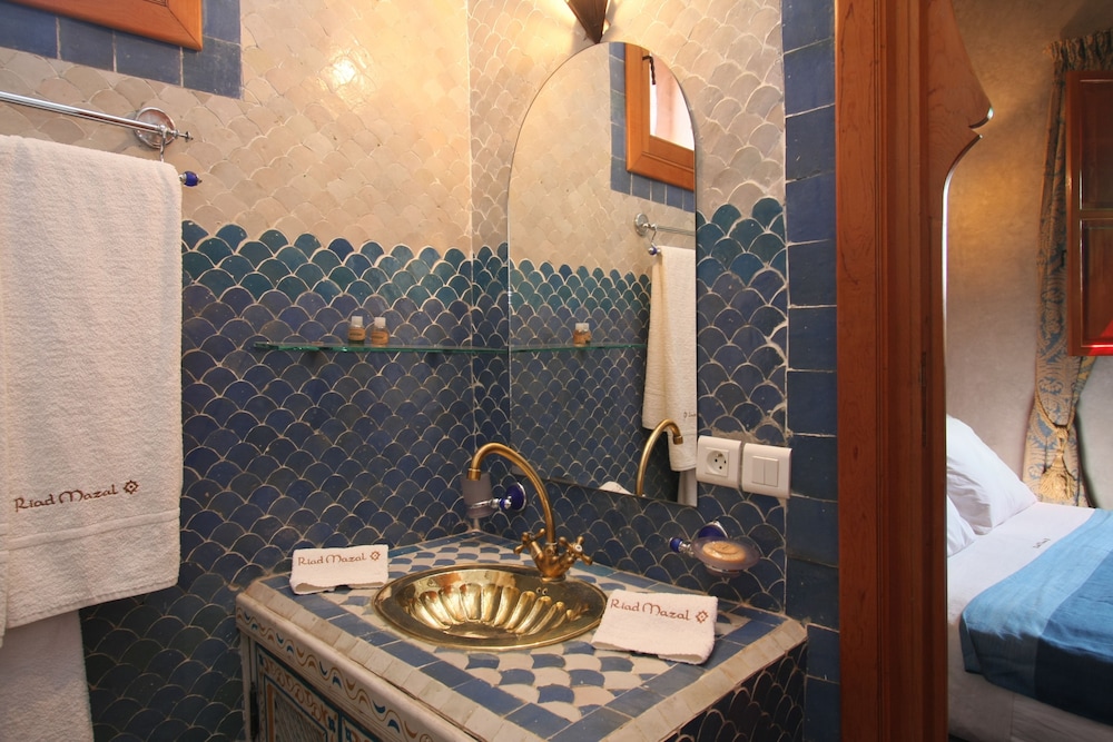 Located in the heart of Guéliz, one of the most beautiful districts of Marrakech, Riad Mazal is a guest house with a privileged location and elegant accommodation near the Majorelle garden with the new museum dedicated to Yves Saint-Laurent, it provides you with free secure parking on site. Riad Mazal offers air-conditioned and elegantly decorated rooms including a minibar with satellite TV. Equipped with coloured tiles, their private bathroom is equipped with a shower or bathrobes and a hair dryer and free toiletries. Each room has been decorated to create a warm atmosphere. Wi-Fi connection is provided free of charge throughout the hotel. Surrounded by many typical Moroccan and international restaurants, New shopping centres, modern, Marrakech plaza, and not far from Jamaâ El Fna Square, 10 minutes by car or taxi.. For your relaxation, the hotel has an outdoor swimming pool and hammam, massages (on request) and a solarium with a magnificent view of the Atlas Mountains. Traditional dishes 100% Moroccan can be prepared on request by the head of the establishment with fresh market produce. Served on the terrace or in one of the common rooms, near the fireplace.Riad Mazal offers you an unforgettable stay with friends or family with exceptional qualities and services.