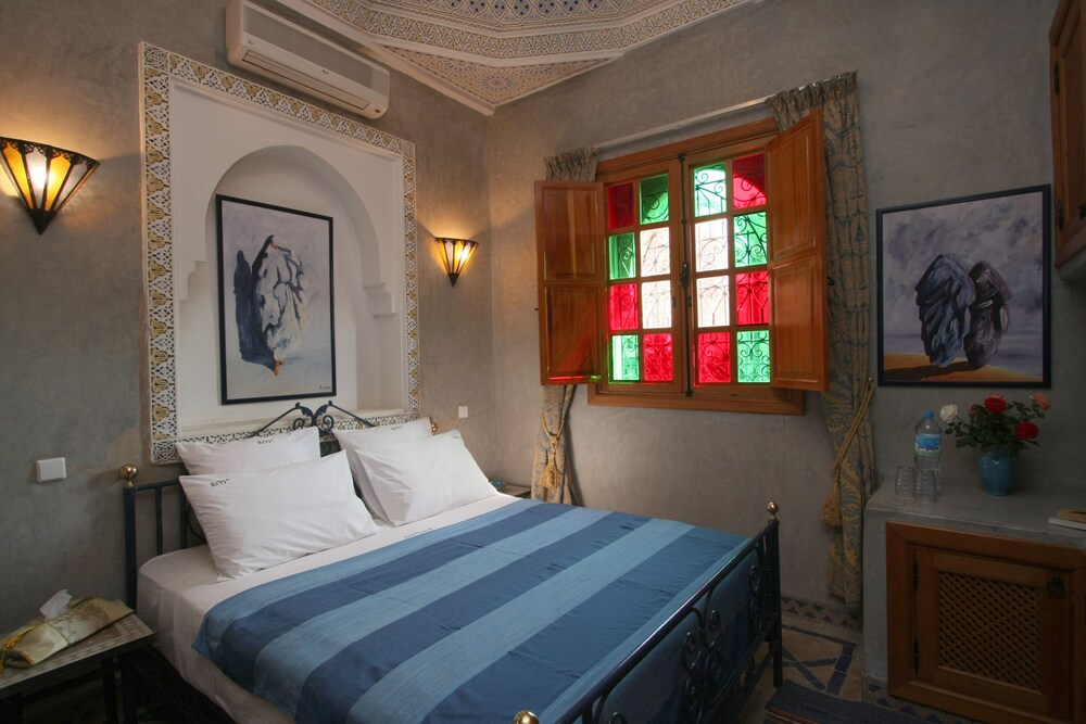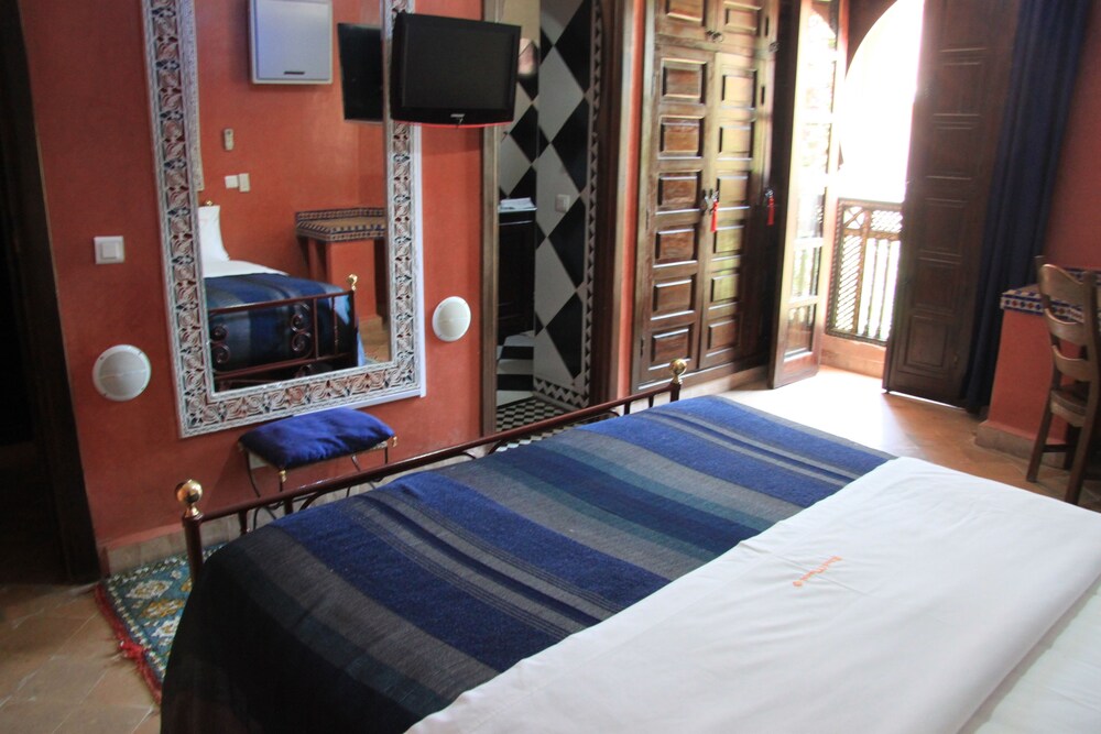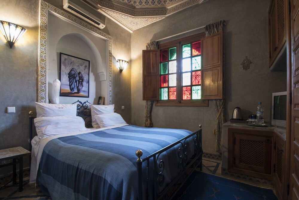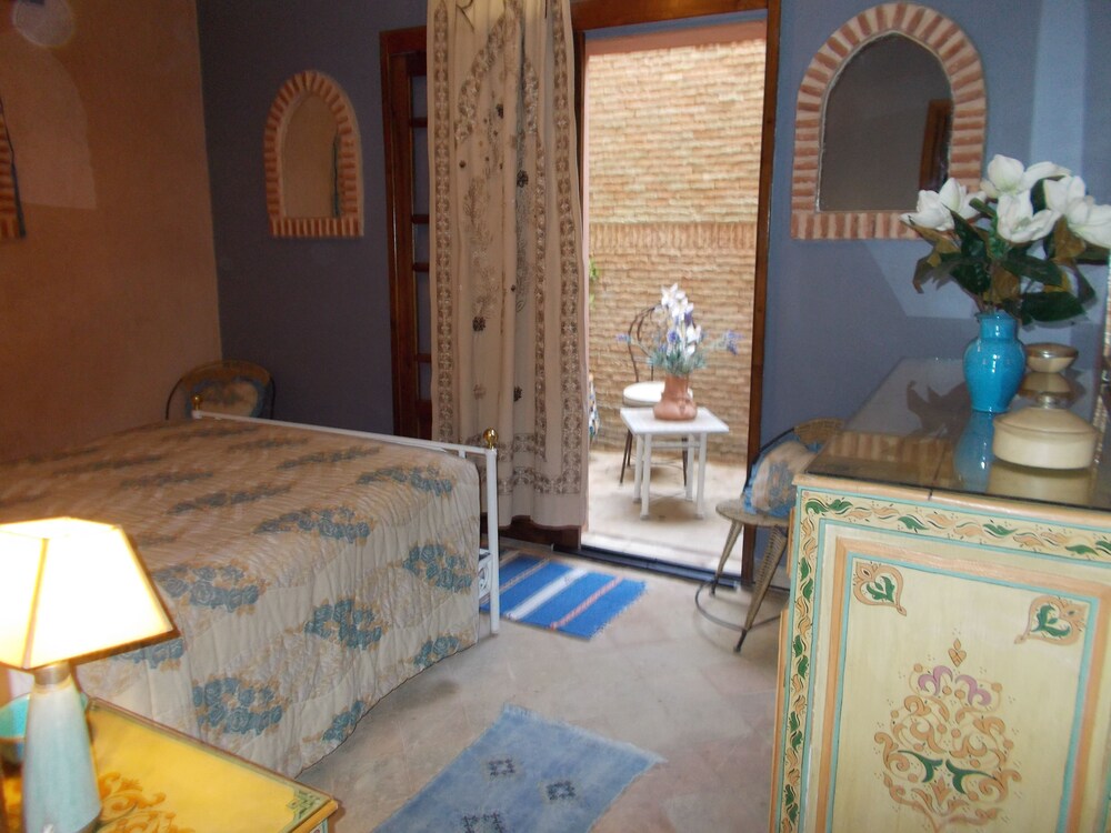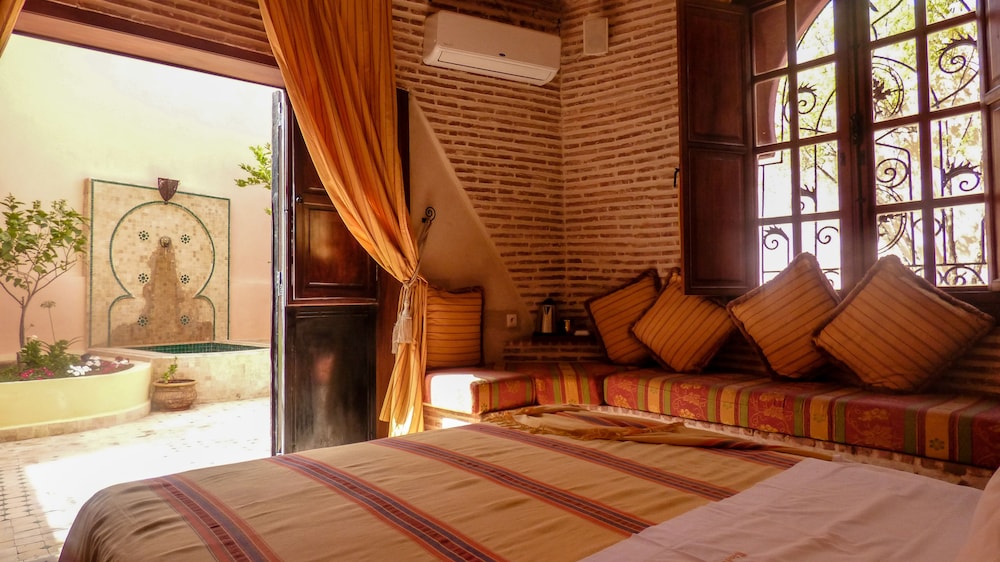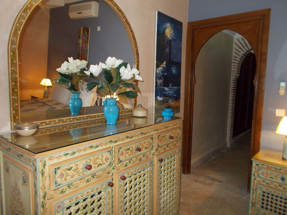 Located in the heart of Guéliz, one of the most beautiful districts of Marrakech, Riad Mazal is a guest house with a privileged location and elegant accommodation near the Majorelle garden with the new museum dedicated to Yves Saint-Laurent, it provides you with free secure parking on site. Riad Mazal offers air-conditioned and elegantly decorated rooms including a minibar with satellite TV. Equipped with coloured tiles, their private bathroom is equipped with a shower or bathrobes and a hair dryer and free toiletries. Each room has been decorated to create a warm atmosphere. Wi-Fi connection is provided free of charge throughout the hotel. Surrounded by many typical Moroccan and international restaurants, New shopping centres, modern, Marrakech plaza, and not far from Jamaâ El Fna Square, 10 minutes by car or taxi.. For your relaxation, the hotel has an outdoor swimming pool and hammam, massages (on request) and a solarium with a magnificent view of the Atlas Mountains. Traditional dishes 100% Moroccan can be prepared on request by the head of the establishment with fresh market produce. Served on the terrace or in one of the common rooms, near the fireplace.Riad Mazal offers you an unforgettable stay with friends or family with exceptional qualities and services.