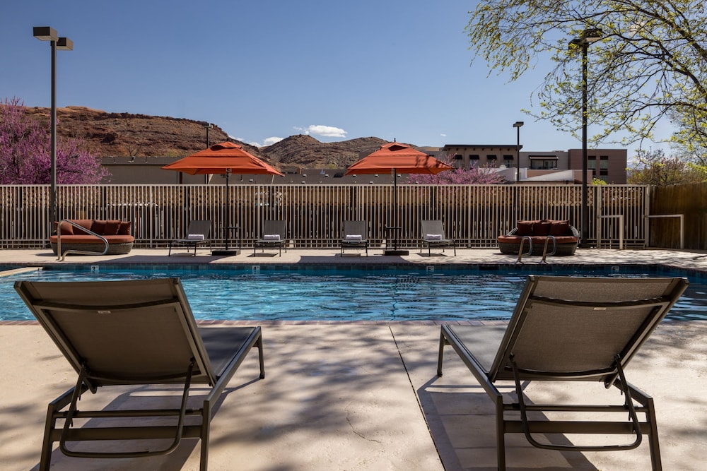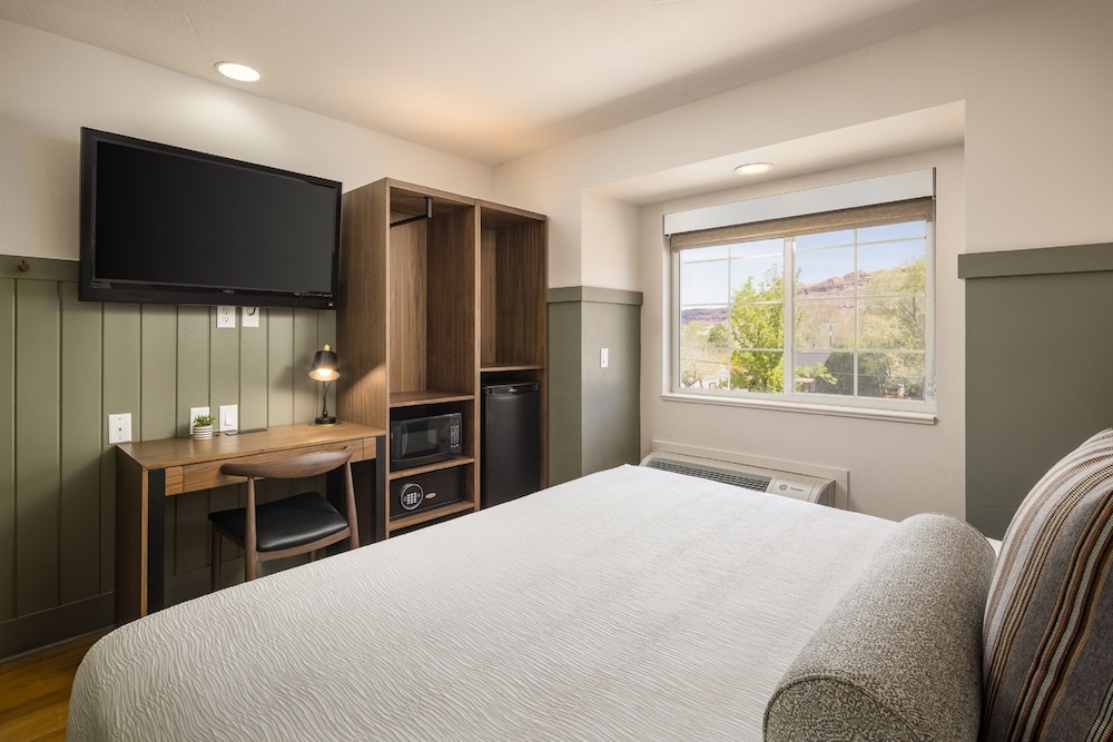 An outdoor pool a location 10 minutes from Arches National Park and well-appointed rooms make River Canyon Lodge Inn & Suites a convenient choice for our guests in Moab. The three-story lodge has 80 rooms offering desks refrigerators microwaves and upholstered window seats. Free Wi-Fi AM/FM clock radios and premium cable TV are also included. Non-smoking rooms are available. The outdoor pool and large hot tub or the cozy chairs and stone fireplace in the lobby offer places to relax after a busy day on the trails. The hotel provides a 24-hour front desk business services tour assistance and free morning coffee and tea service in the lobby. Free parking includes boat trailers ATVs and bikes. Pets are welcome. Four blocks from downtown Moab the hotel is five miles from Arches National Park. Dead Horse Point State Park is 40 minutes away and Canyonlands National Park is a 50-minute drive. Goblin State Park great for hikers and off-roaders is less than an hour away and the La Sal Mountains about a half-hour drive offer miles of backcountry for cross-country skiing snowshoeing and snowmobiling during winter months. For something different practice your swing at Moab Golf Course five miles from the hotel or tour a local winery: Spanish Valley Vineyards is 11 minutes away. Canyonlands Field Airport is 18 miles and Grand Junction Regional Airport is 113 miles northeast of the hotel.