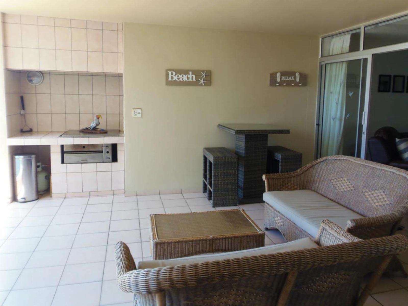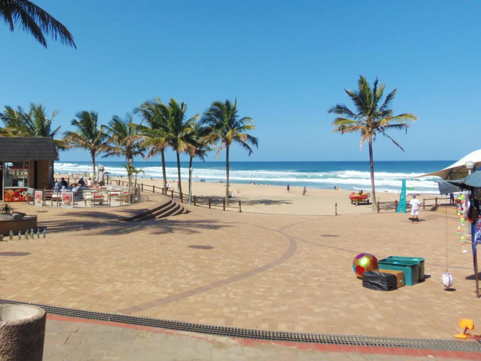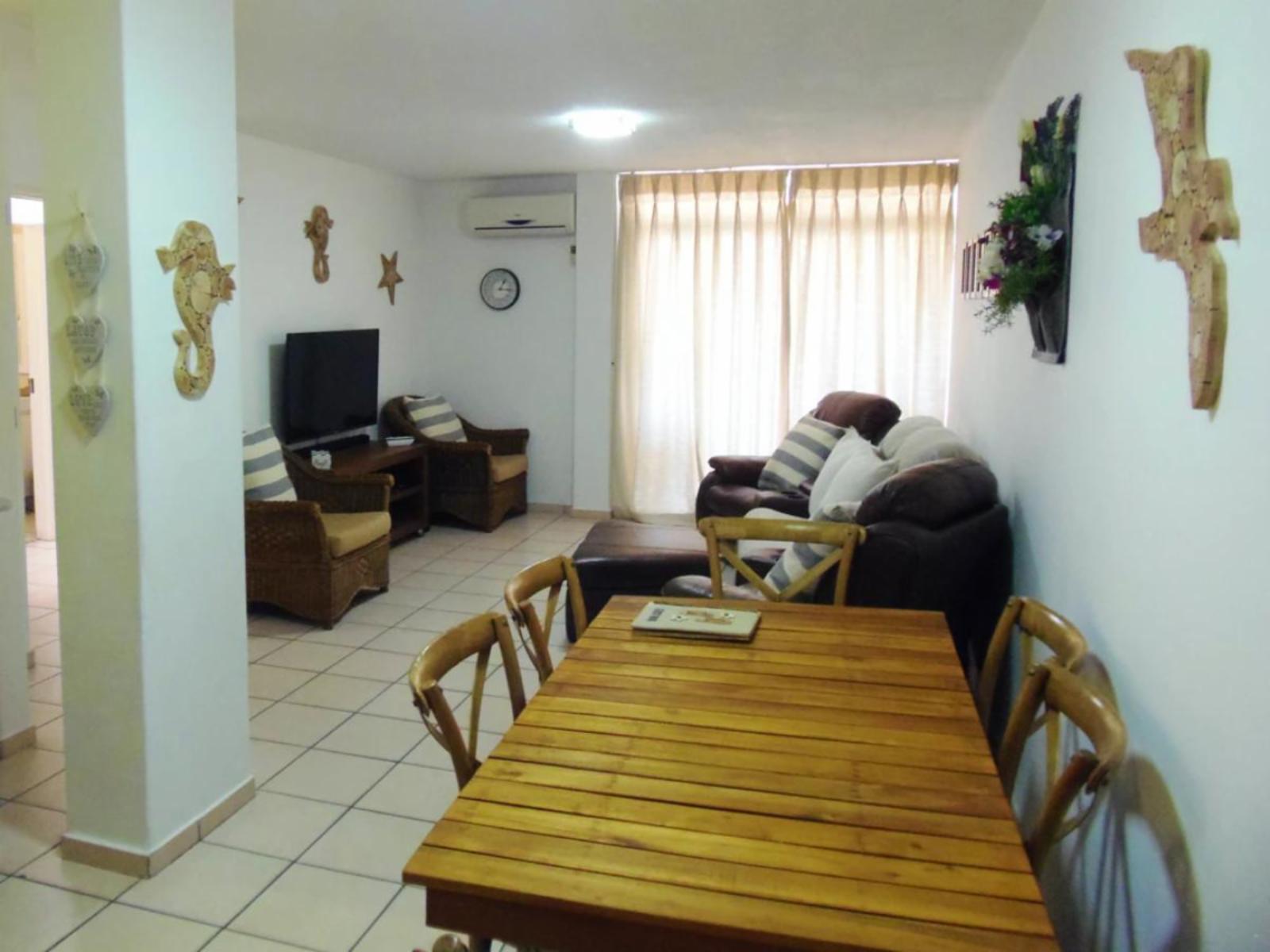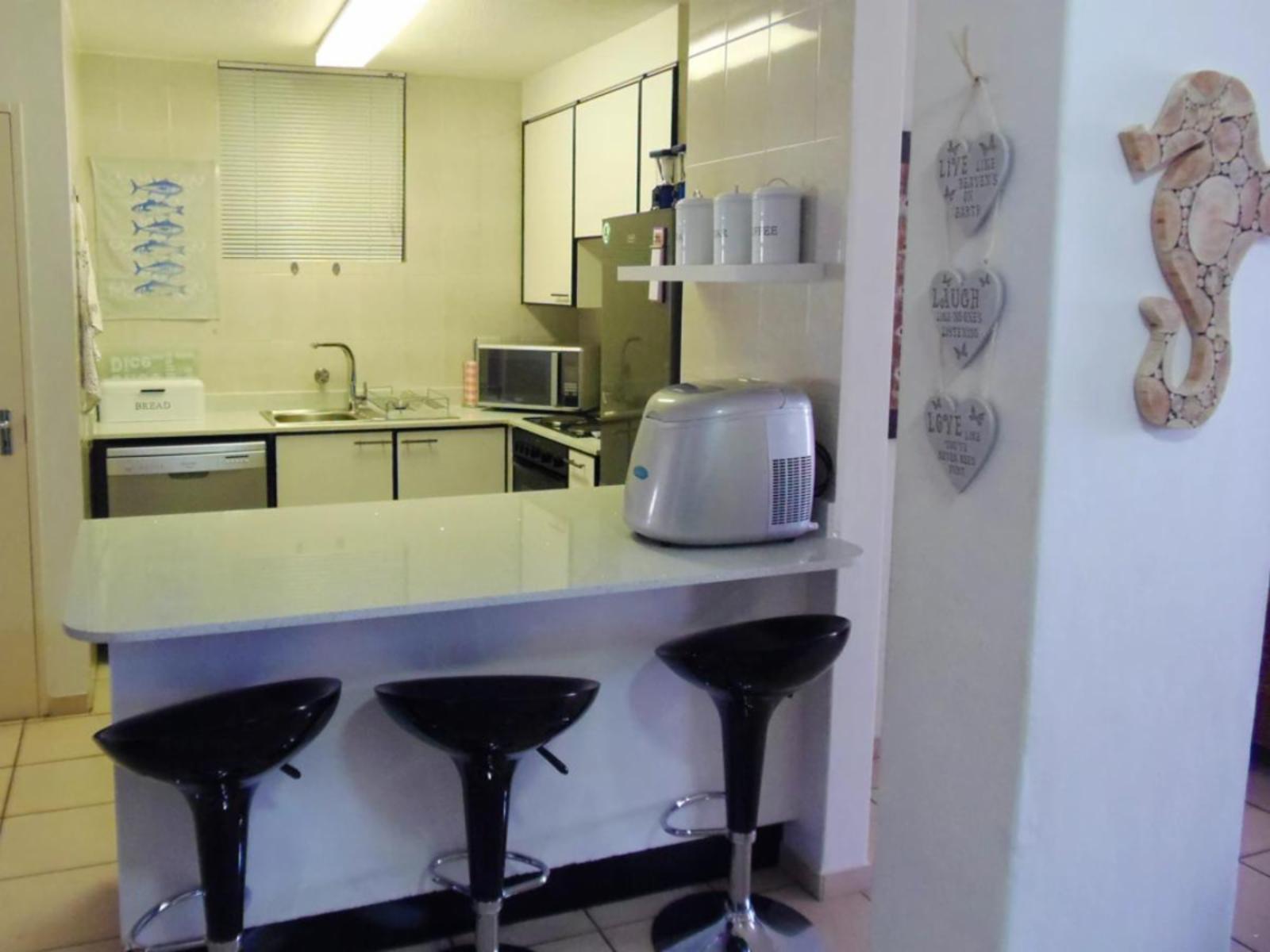 Rondevoux A is a self-catering apartment located in Margate, on the South Coast of KwaZulu-Natal Province. The apartment sleeps six guests and comprises three bedrooms, two bathrooms, and an open-plan kitchen and living area. The main bedroom comprises a queen-size bed and an en-suite bathroom. The second bedroom comprises a double bed, while the third bedroom contains two single beds. The second bathroom is fitted with a bath, toilet and washbasin. Ceiling fans are available in all the bedrooms. The fully equipped kitchen features a stove, fridge-freezer, ice maker,