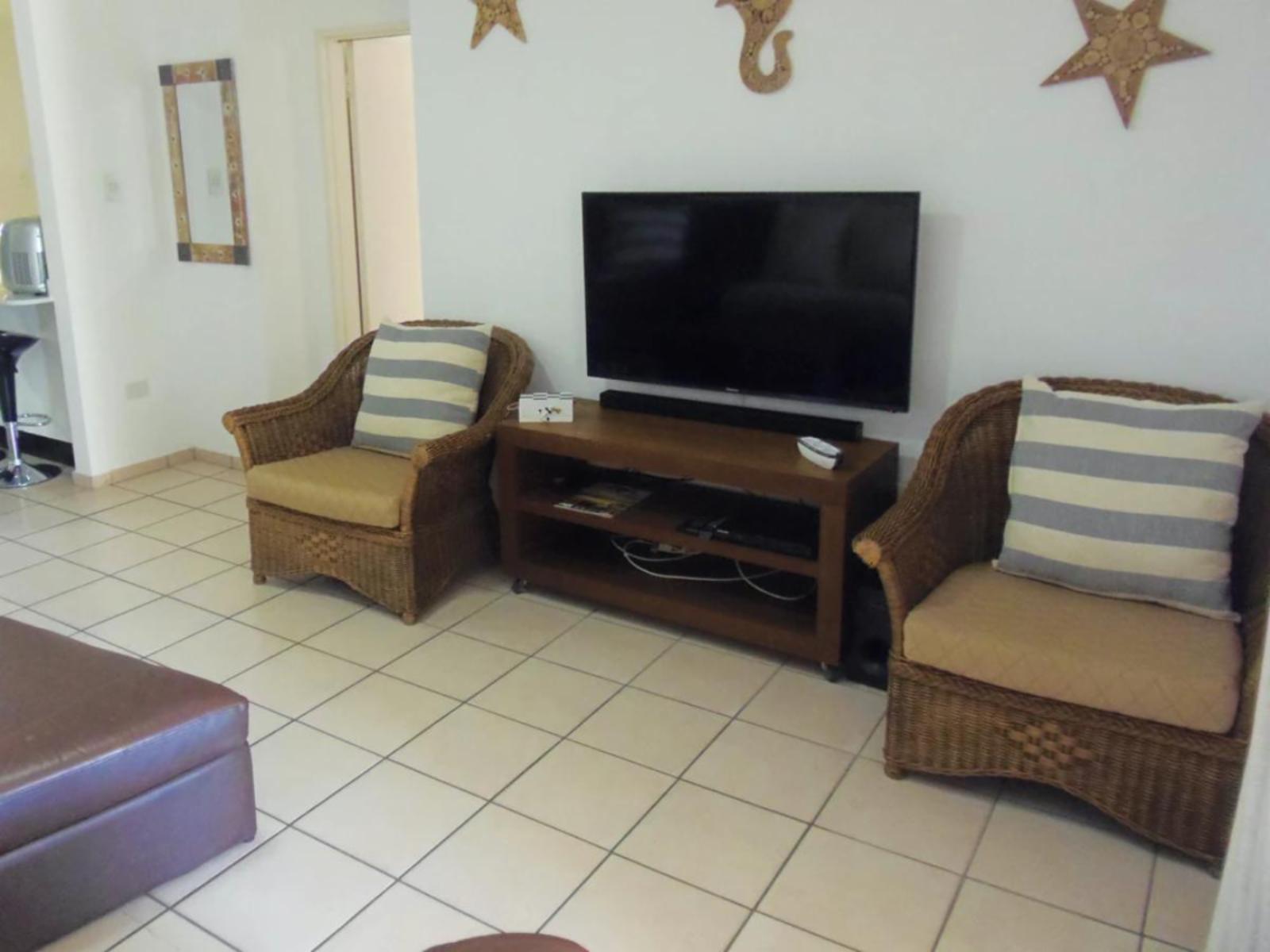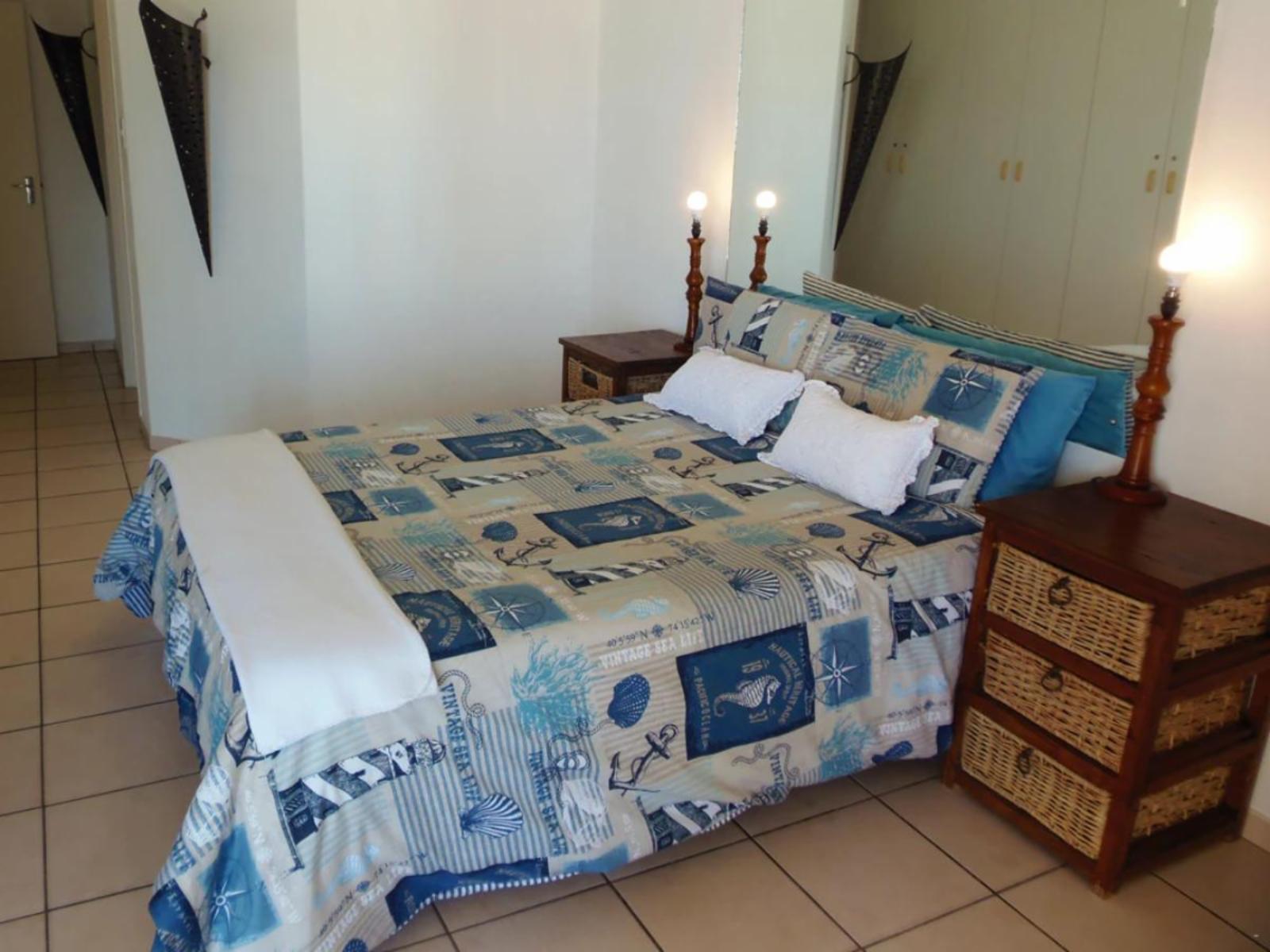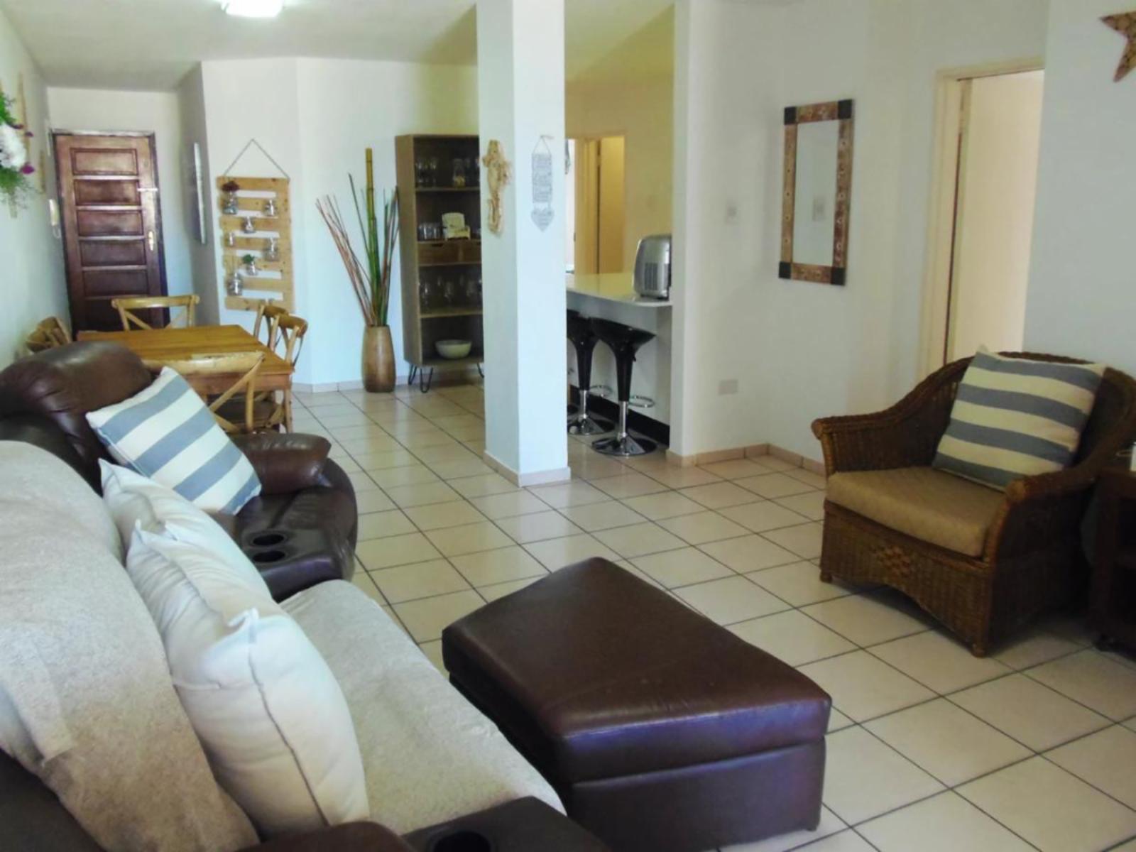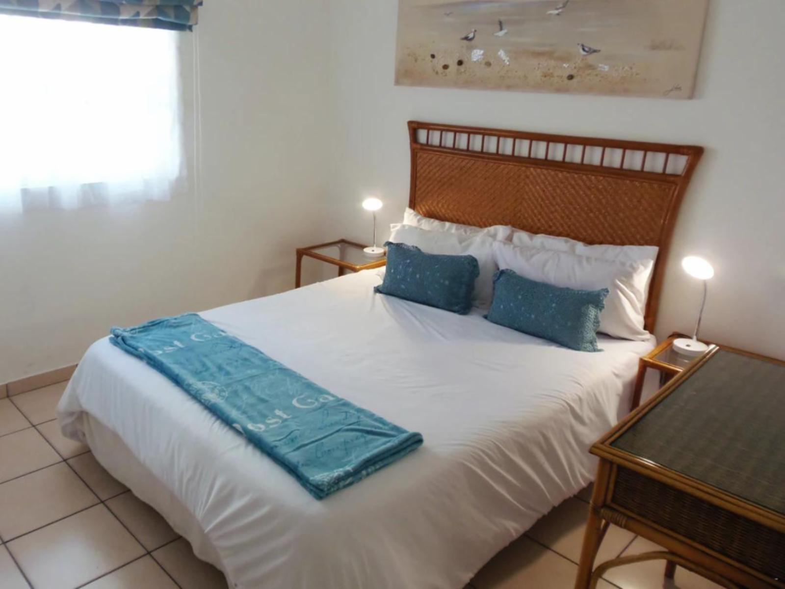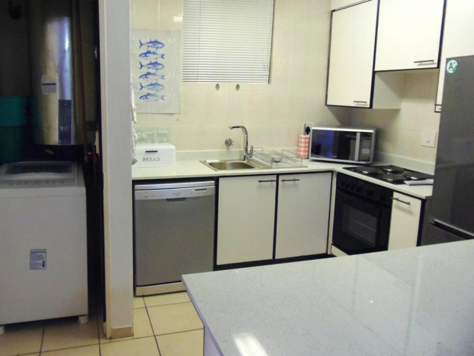 Rondevoux A is a self-catering apartment located in Margate, on the South Coast of KwaZulu-Natal Province. The apartment sleeps six guests and comprises three bedrooms, two bathrooms, and an open-plan kitchen and living area. The main bedroom comprises a queen-size bed and an en-suite bathroom. The second bedroom comprises a double bed, while the third bedroom contains two single beds. The second bathroom is fitted with a bath, toilet and washbasin. Ceiling fans are available in all the bedrooms. The fully equipped kitchen features a stove, fridge-freezer, ice maker,