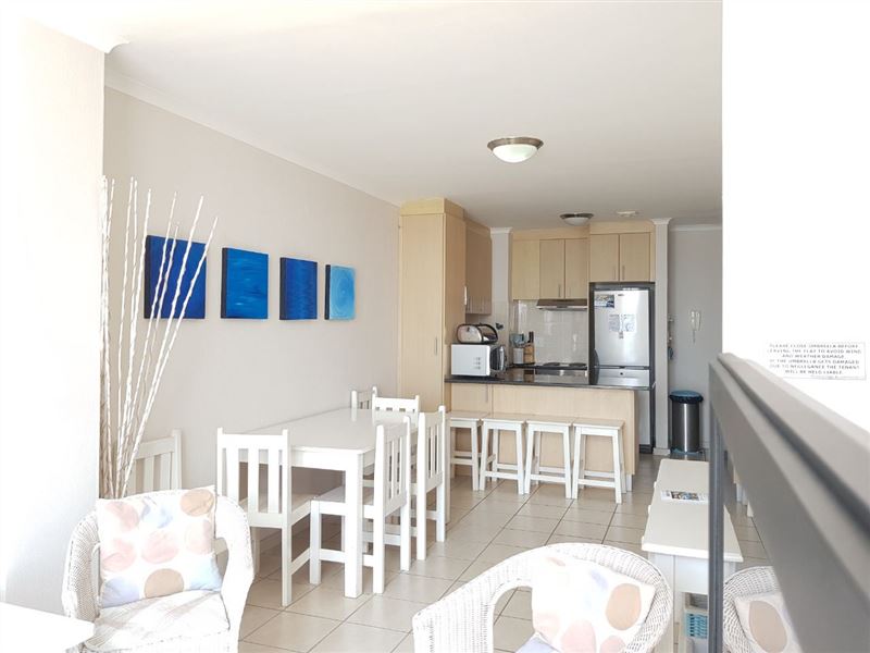 The unit has two bedrooms and two bathrooms. The fully equipped kitchen features a dishwasher. The living area is equipped for cosy seating, a TV with certain DStv channels. Braai facilities are also available.