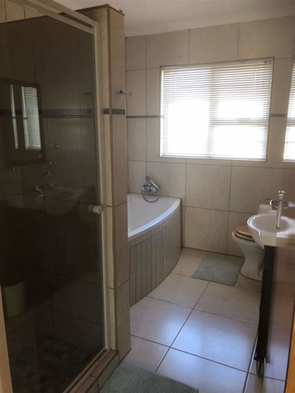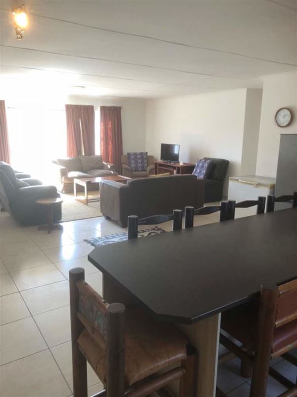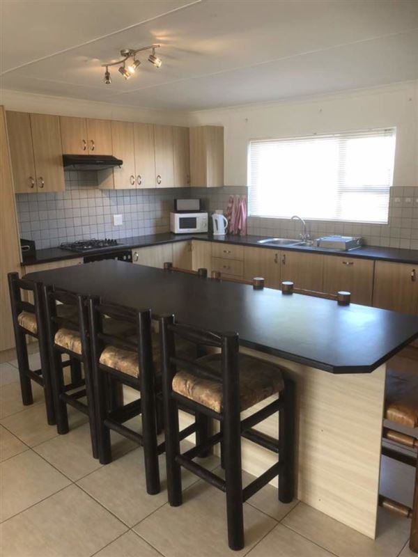 The house comprises three bedrooms, two bathrooms. The main bedroom is fitted with a King-sized bed with an en-suite bathroom, aircon and a cupboard. The kitchen is fully equipped with a stove, microwave, oven and coffee machine. Guests have access to an outside verandah with braai facilities as well as secure parking in a double garage.