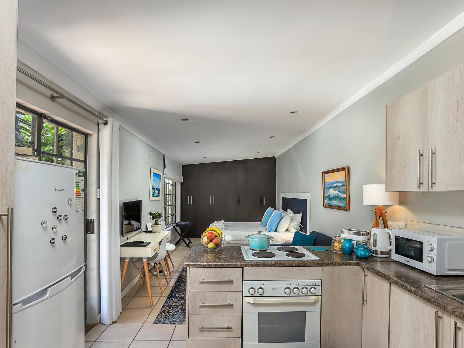 Recently refurbished (August 2019), Seven Palms is a quiet, convenient, and comfortable poolside studio apartment. Whether you are visiting Jozi, our City of Gold, on business or pleasure, or just passing through, Seven Palms proudly extends an escape from stress. Unwind in our contemporary and luxurious self-catering retreat under whispering palm trees on oak-lined Dover Street in the centrally located suburb of Westdene. Seven Palms offers free uncapped WiFi and a quiet work space for those on business. Otherwise simply relax in your home-from-home with a braai (barbe