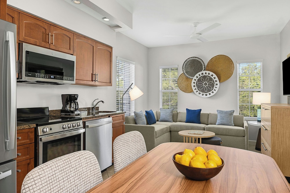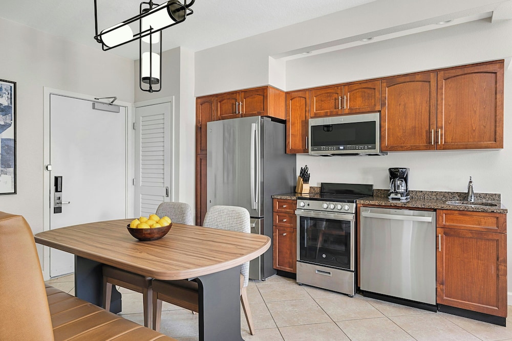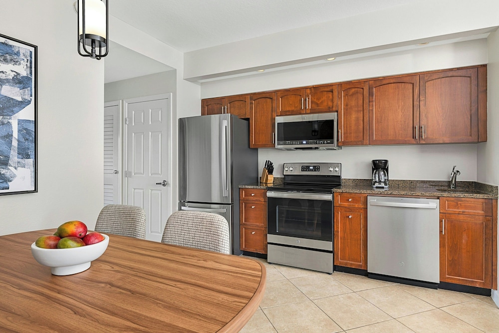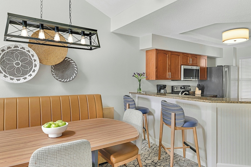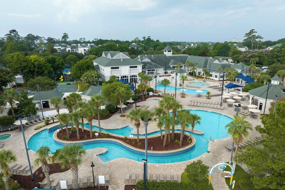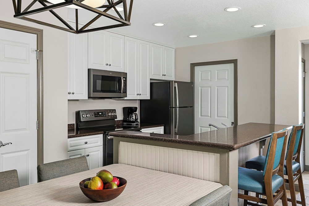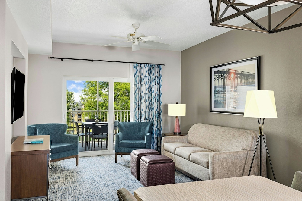 Free parking plush beds spacious kitchen suites two pools and Broadway at the Beach a quarter-mile away make the non-smoking Sheraton Broadway Plantation one of the most popular hotels in Myrtle Beach among our guests. The Sheraton has 460 spacious one- and two-bedroom villas arrayed in 19 buildings on landscaped grounds with a lake. All villas have living rooms sofa beds separate dining areas washers and dryers two TVs with premium cable and Wi-Fi (for a fee). You also get a kitchen with two-burner stovetop (larger villas have ovens and four burners) microwave full refrigerator blender toaster coffeemaker cookware and tableware. Step outside and into the unheated outdoor pool. The kids will go home and rave about the seasonal splash cove and miniature golf course. The Sheraton also has an indoor pool outdoor hot tub seasonal poolside bar and grill tennis and basketball courts fitness center and free on-site parking. The Sheraton is off US-17 a quarter-mile northeast of Broadway at the Beach and Ripley's Aquarium. The ocean is one mile southeast. If you're driving from Myrtle Beach International Airport the hotel is six miles northeast.