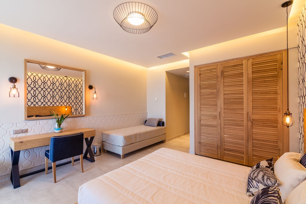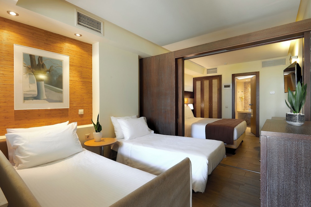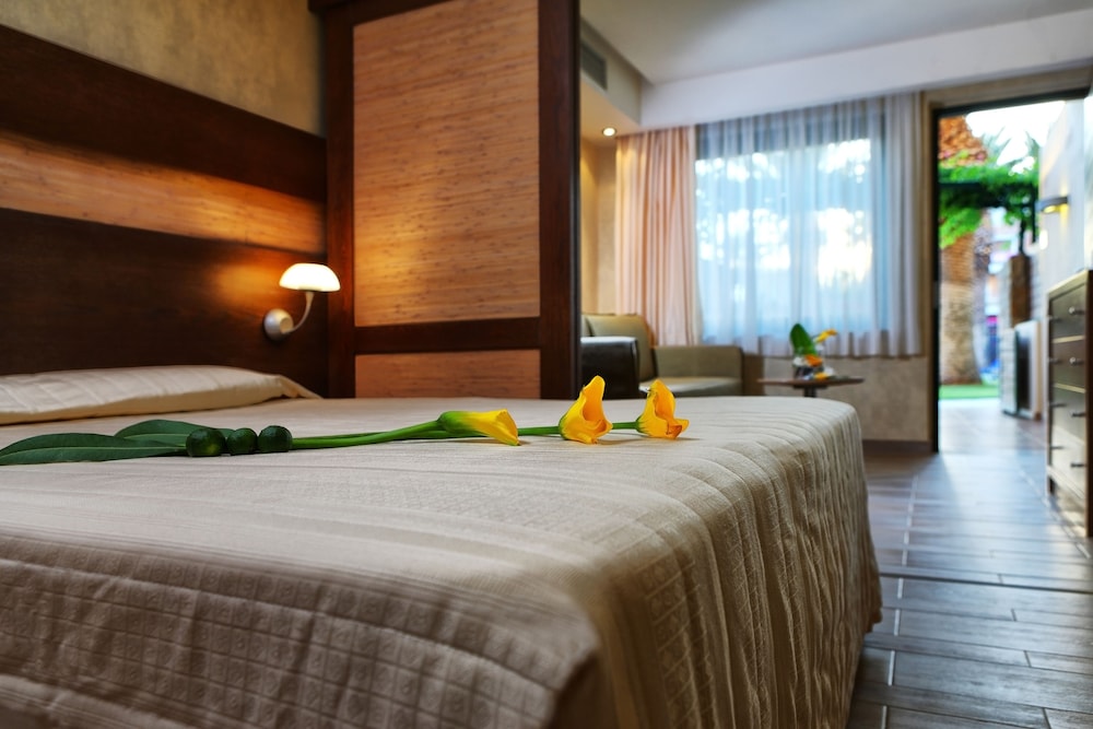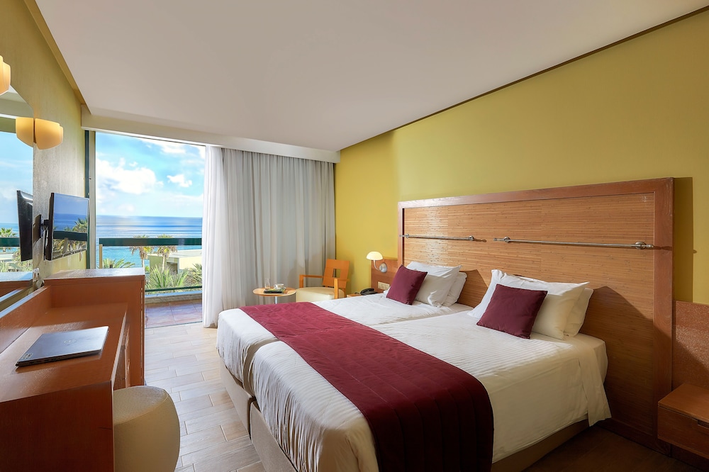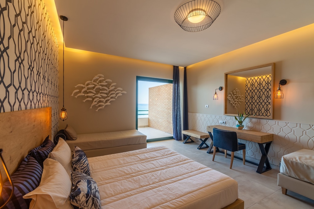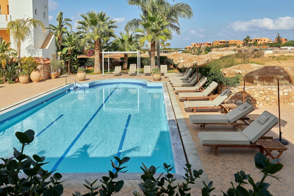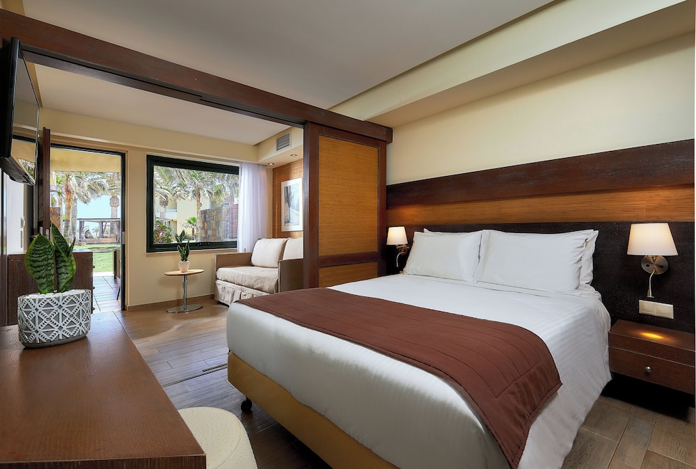 Sirens beach hotel & village is situated 30 km east from the international airport of Heraklion, in Malia,just on a beautiful sandy beach. It has a central location between Agios Nikolaos and Heraklion.The hotel has an ideal spot for excursions throughout the whole Island, as well as sightseeing in the area of Malia. The hotel features beautiful gardens, 3 swimming pools and one children's pool. There is also a poolside restaurant, 4 beach/pool bars, a Greek "Kafenion" and a children's playground. Moreover a lobby bar, TV room, boutique and a mini market, fitness room (with Cybex equipment).All rooms are fully equipped with private bath, satellite T.V., music programs, air conditioning, refrigerator, hairdryers, telephone with direct line and a veranda or balcony.2 tennis courts with floodlights, mini golf, ping-pong, beach volley and of course water sports.