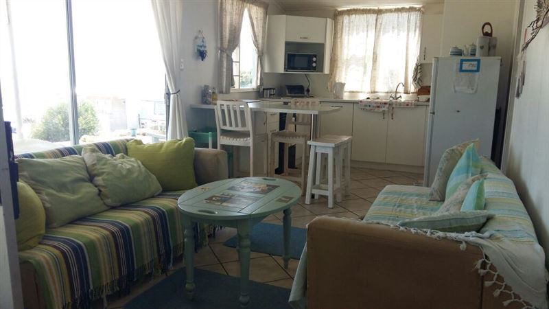Swerwer's Rus is a charming cottage in the Gansbaai Caravan Park and only 80 m from the beach, with a beautiful view of Gansbaai harbour and the sea. Gansbaai, between the villages of Hermanus and Pearly Beach, lies in Walker Bay at the foot of the Dynefontein Mountains with its magical coastline, rich in fynbos.This cottage has two bedrooms, one bathroom, and an open-plan kitchen and living area. The kitchen is equipped with a fridge, stove, oven and microwave. The lounge has comfortable seating and a TV with selected DStv channels. Guests have access to braai faciliti