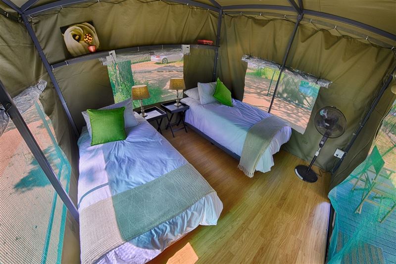 Tented Adventures Pretoriuskop offers an authentic tented safari experience, situated within Pretoriuskop Rest Camp in the Kruger National Park. The area is home to Africa’s Big 5. This is the ideal getaway for couples and individuals seeking adventure. Accommodation is offered in 8 safari tents, suited for two people sharing. Rates include a full English and continental breakfast, a dinner braai buffet, and a morning and afternoon game drive. The comfortably appointed safari tents offer the glamping luxuries including electricity, electric blankets, a small deck, high