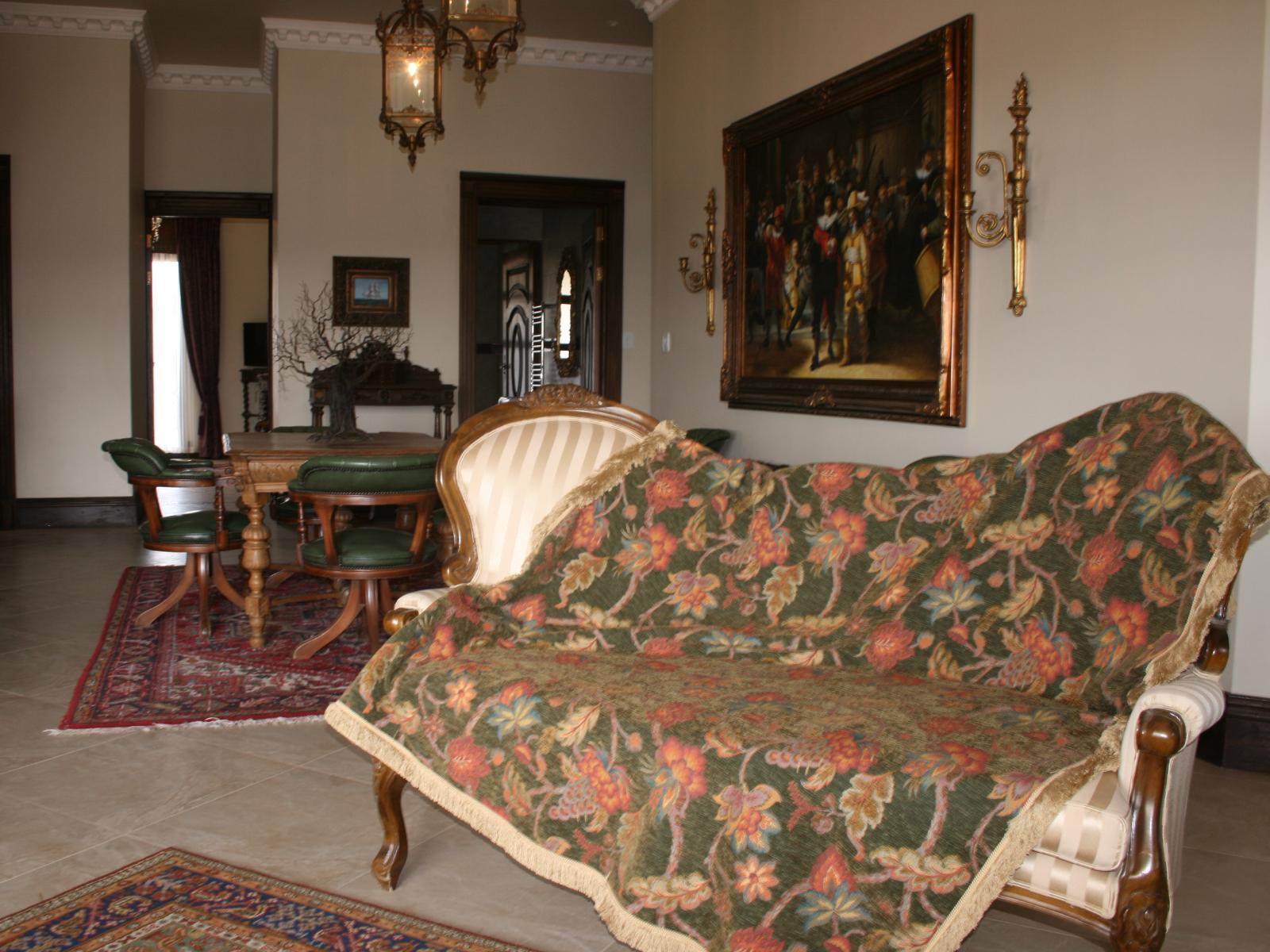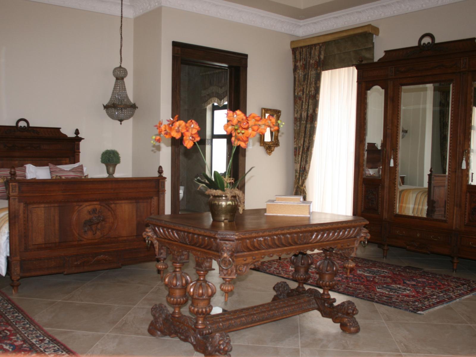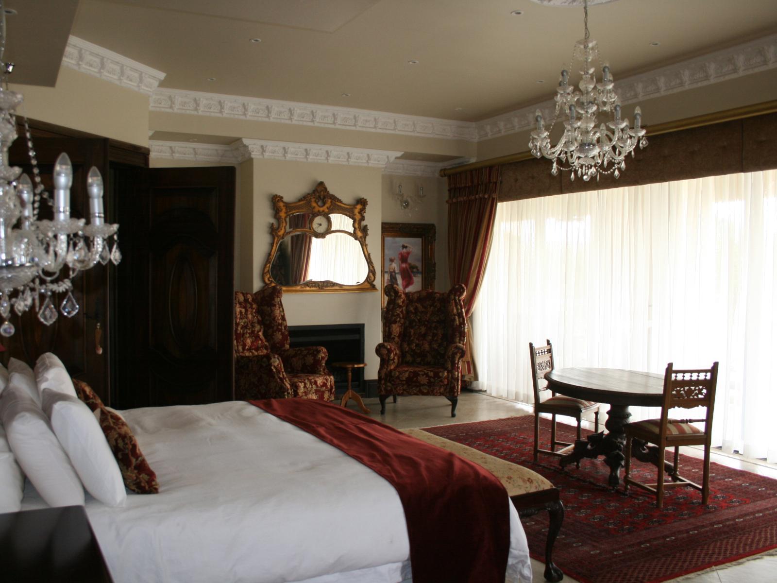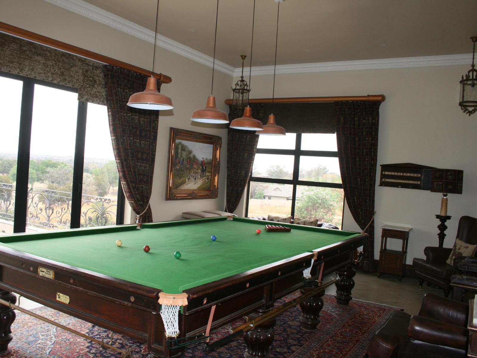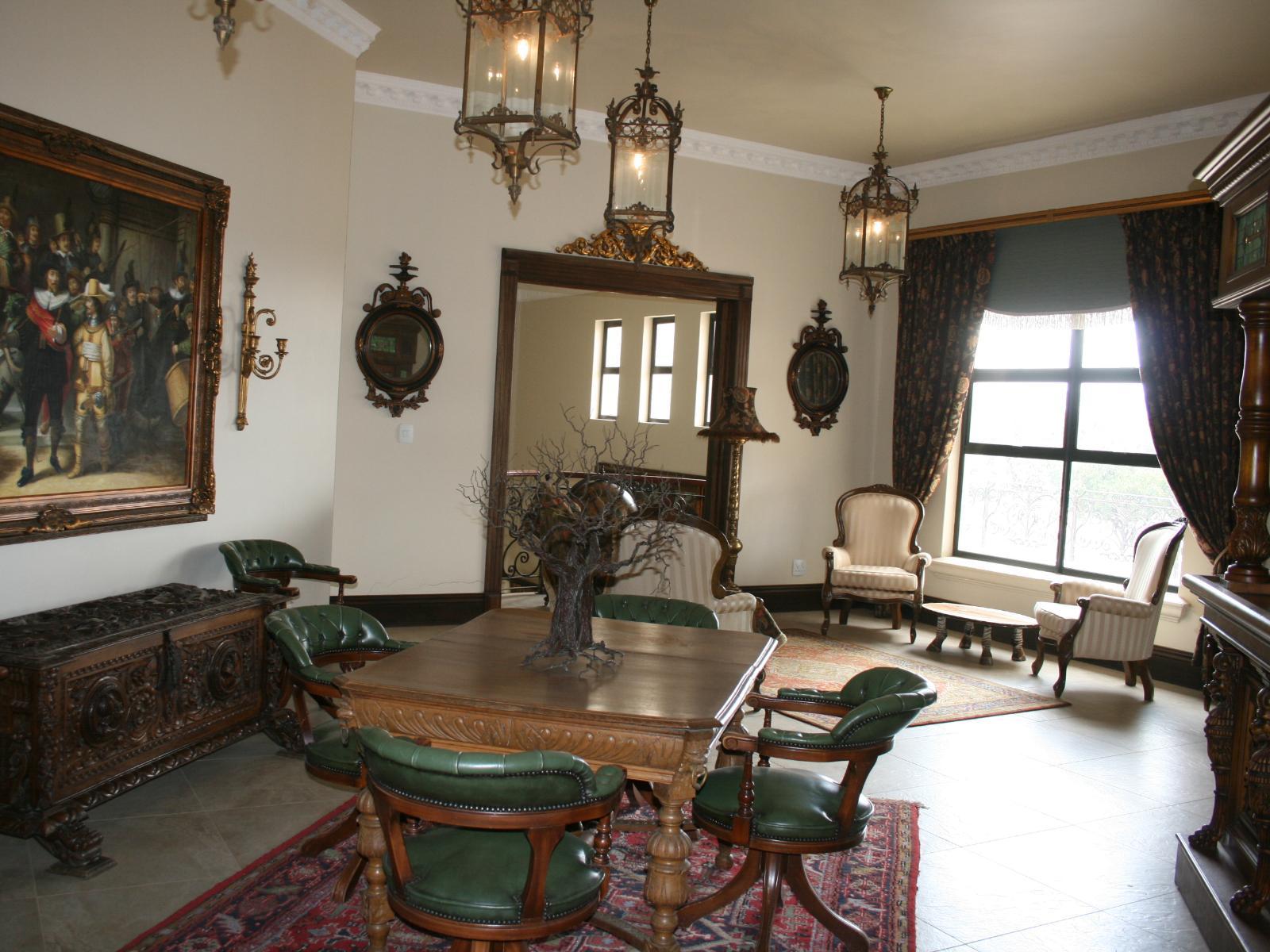 The stately Duke’s Manor Guesthouse holds guard over the undulating greens of Koro Creek Golf Estate, situated in Modimolle, Limpopo, a mere 23km from Bela-Bela (Warmbaths). The furniture throughout this grandiose manor is rich in color and texture, it adorns every room, enhanced by high ceilings, decorated cornices, period apropos gilded framed mirrors and pictures, fine embellishments and ornate light fixtures. From the entrance hall, a curved staircase embraced by iron-metal balustrades lead you to the upper level with a full-size billiard room, bar, lounge and conf