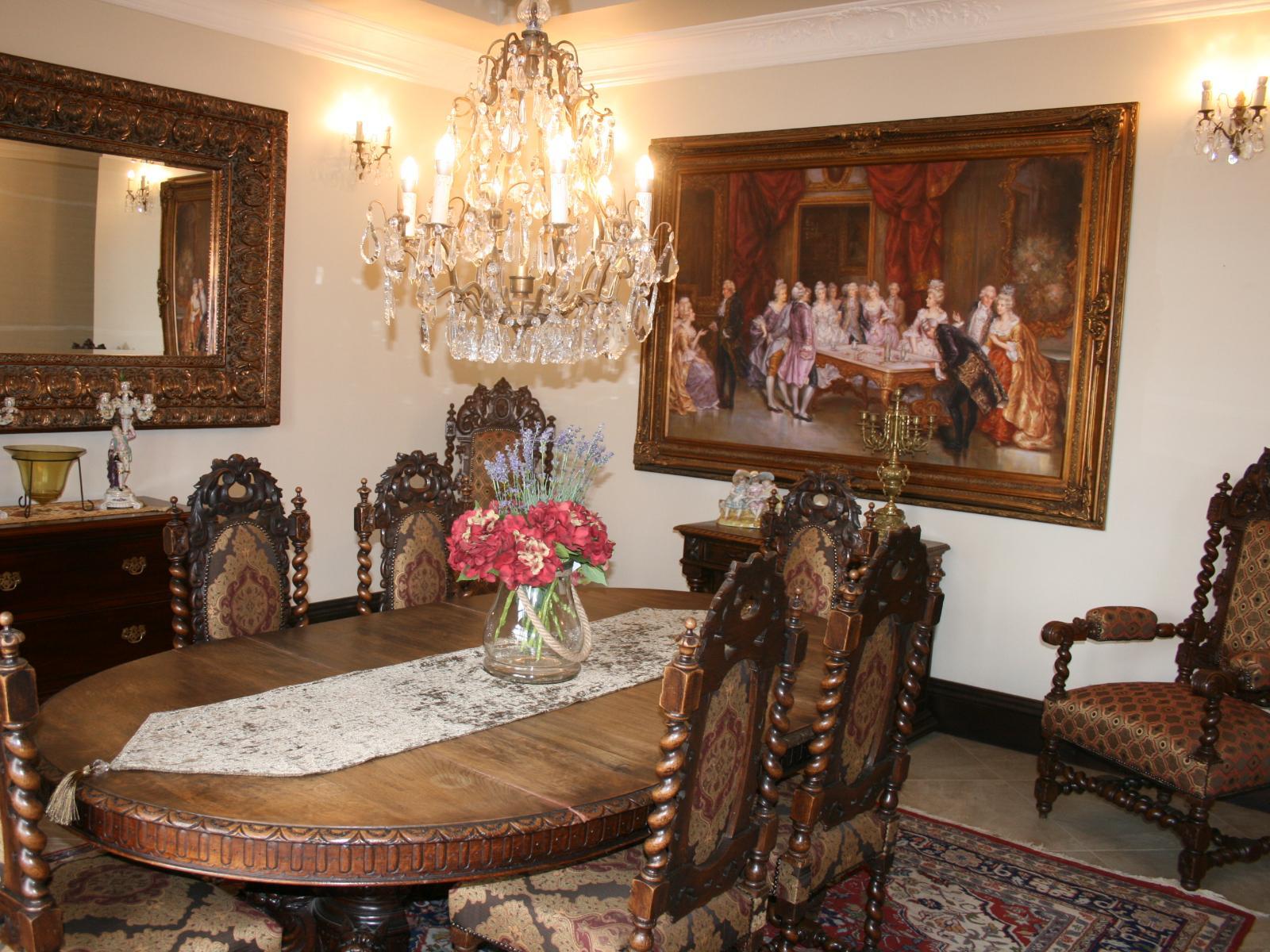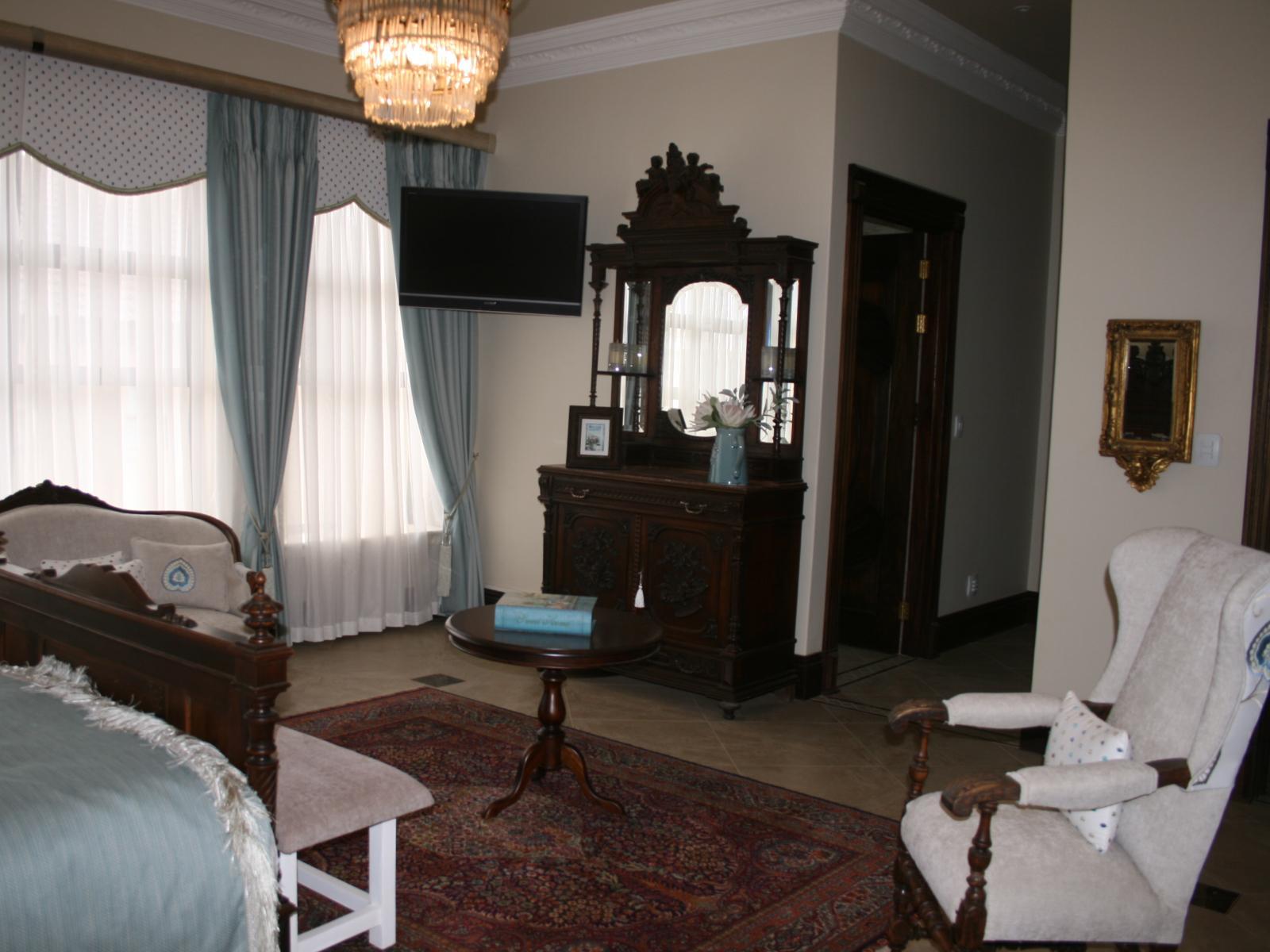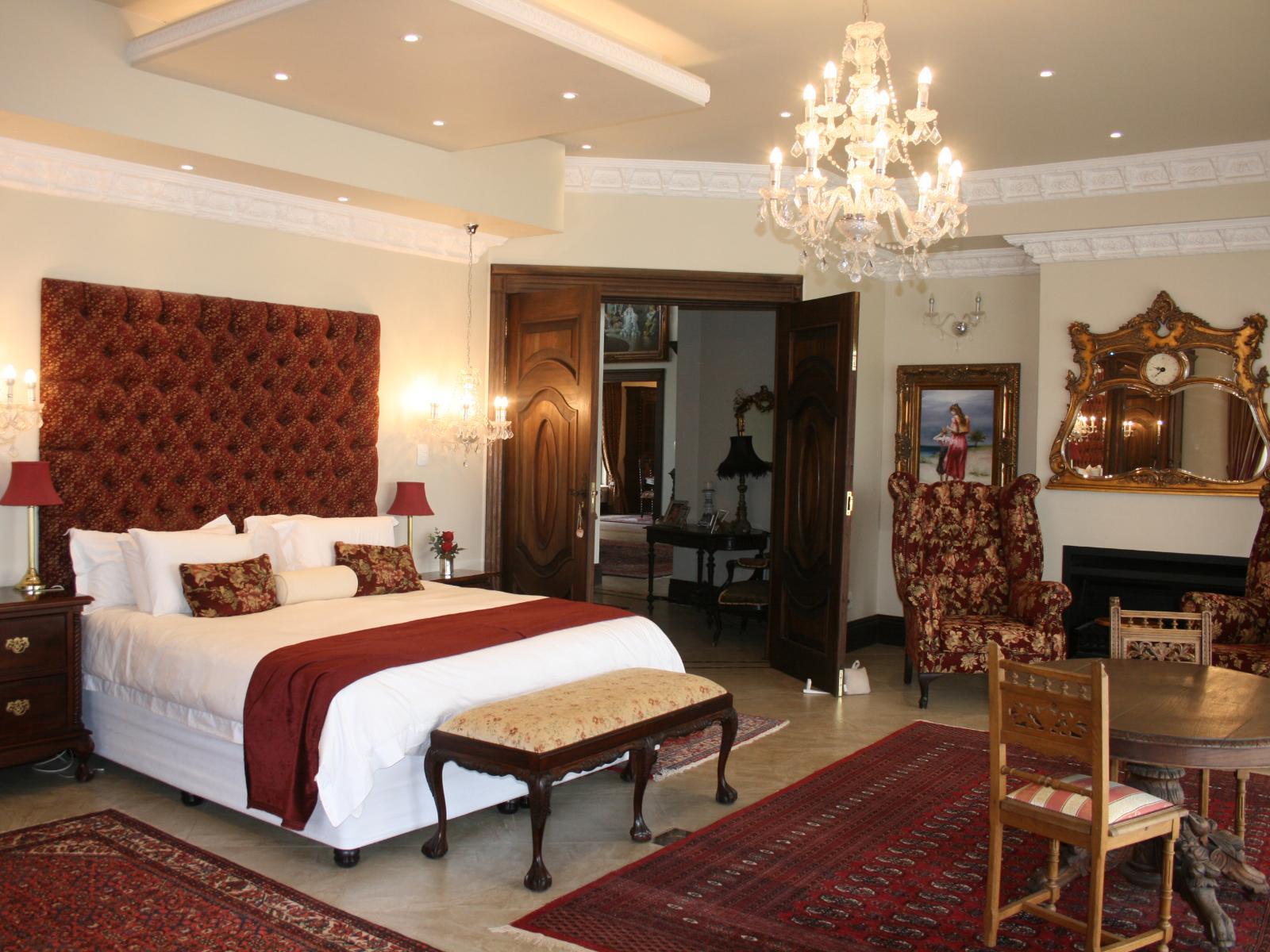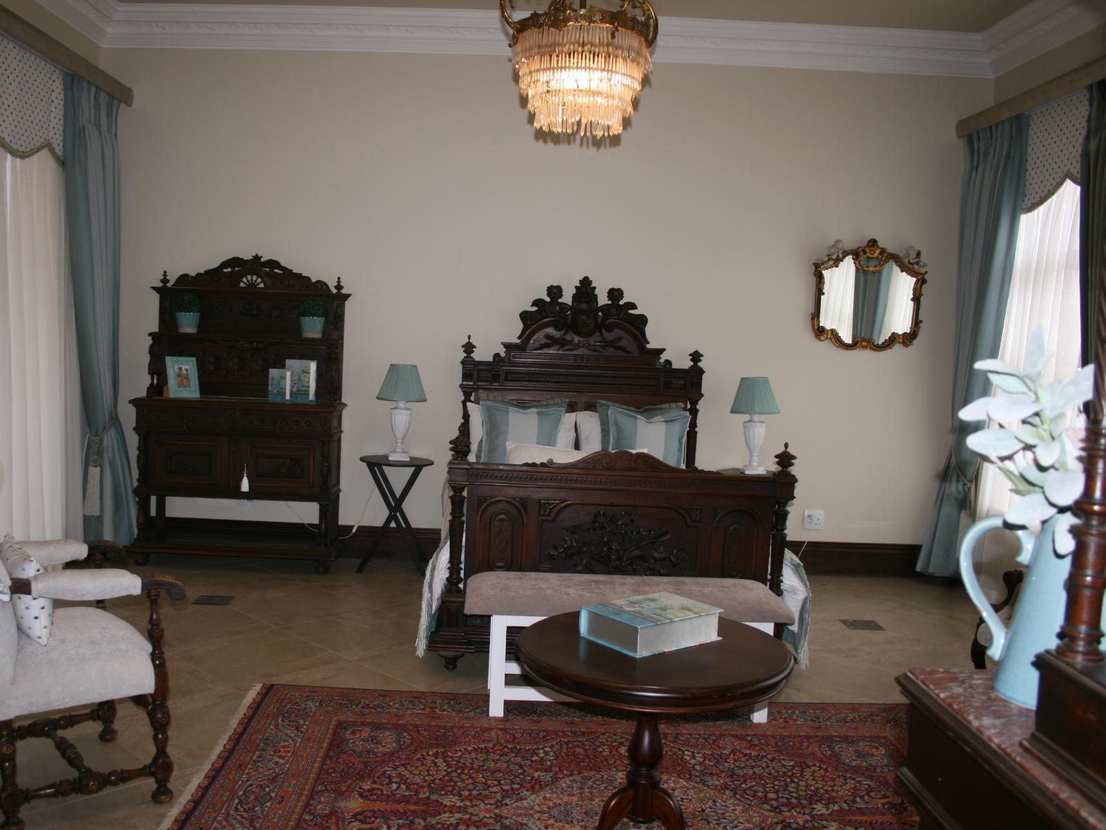 The stately Duke’s Manor Guesthouse holds guard over the undulating greens of Koro Creek Golf Estate, situated in Modimolle, Limpopo, a mere 23km from Bela-Bela (Warmbaths). The furniture throughout this grandiose manor is rich in color and texture, it adorns every room, enhanced by high ceilings, decorated cornices, period apropos gilded framed mirrors and pictures, fine embellishments and ornate light fixtures. From the entrance hall, a curved staircase embraced by iron-metal balustrades lead you to the upper level with a full-size billiard room, bar, lounge and conf