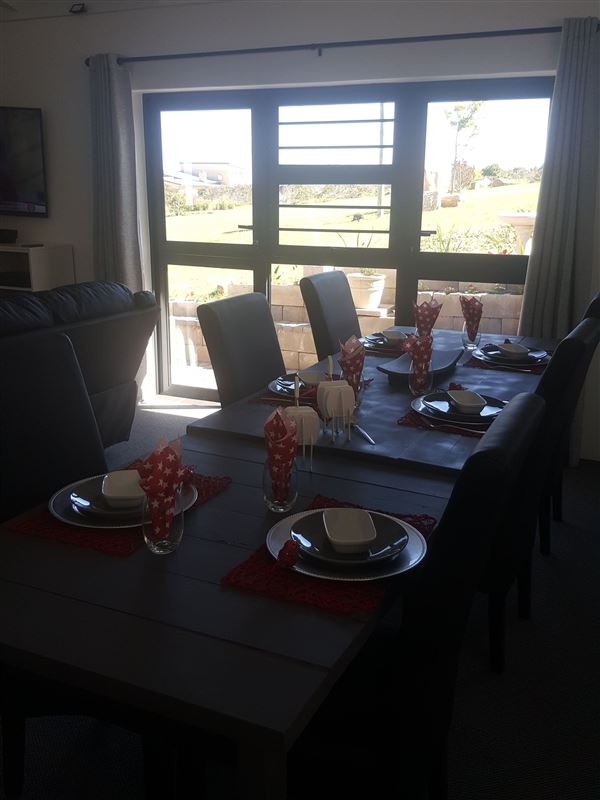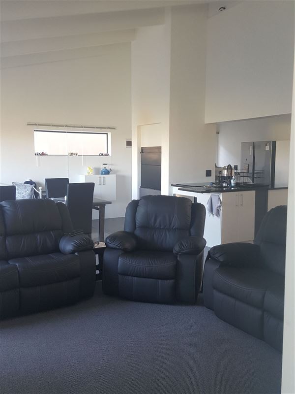 The kitchen is equipped with a fridge, microwave, oven, stove and other appliances. The open-plan living area has a built-in braai. The house has a double garage with an automatic door and a door leading directly into the house.
