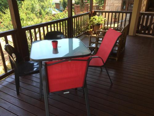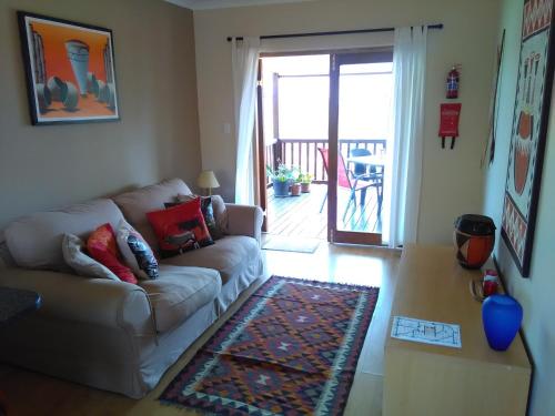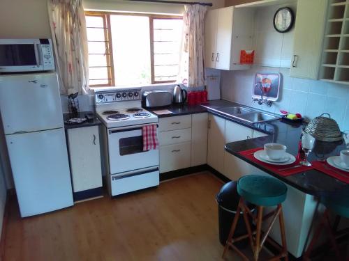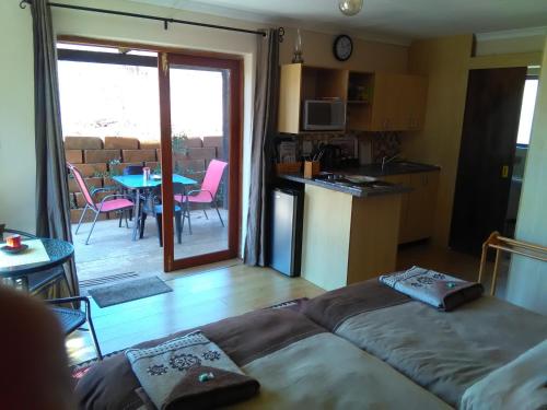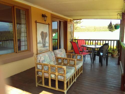 Our larger suite the Bridal Veil Falls Suite, is a one bedroom flatlet with double bed, open-plan full kitchen, dinette, and lounge. The covered wooden deck has wonderful views, perfect for longer stays.