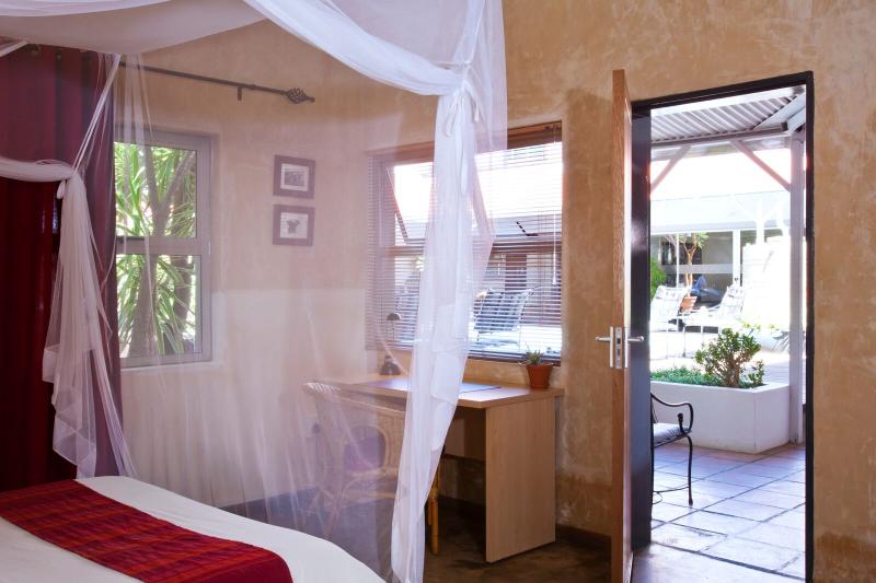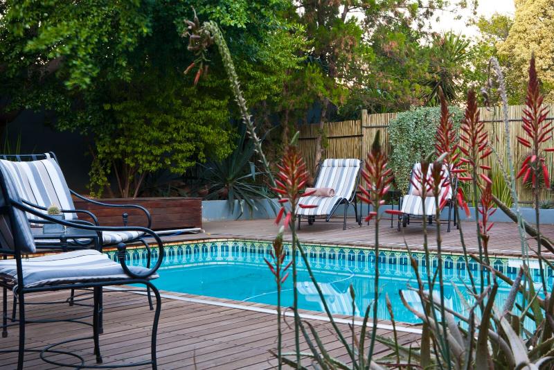 The Guesthouse is a small and informal retreat offering highly-personalised service. The sparkling blue swimming pool embedded in a wooden deck with comfortable loungers, and the verandah overlooking lush tropical gardens offer ample opportunity to relax. In order to stay in touch with the outside world, WiFi is available throughout the property. Vondelhof is centrally located at a 5 minute walking distance of Windhoek's attractive city centre with its parks, museums, restaurants and many other attractions..Vondelhof is easily accessible from the international airport and the main roads flowing into Windhoek. Secure parking is offered on site.In addition to the delicious and well-assorted continental breakfast buffet, we also provide scrumptious light lunches.In short, Vondelhof is an ideal place to start and end a trip through Namibia.