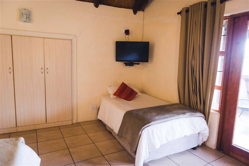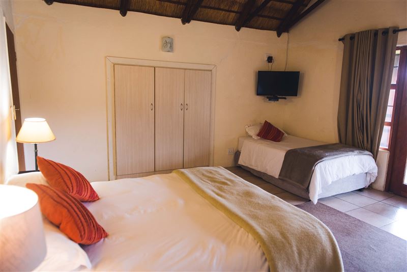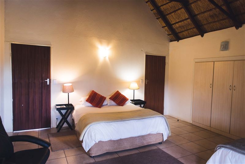 The lodges consist of a master bedroom, with DSTV and a luxurious queen size bed and a second bedroom with three single beds for the kids. Each room has a large glass sliding door, looking out onto the natural habitat.